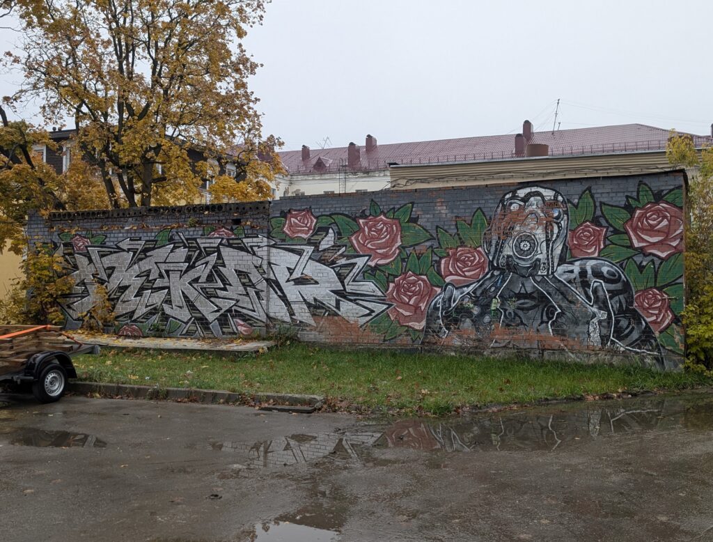 Мелкий дождь неприятен, но пережидать его смысла нет — небо целиком затянуто низко висящими тучами, которые явно не собираются расходиться в ближайшие часы. Начинаем движение от вокзала в сторону центра. Поскольку мы здесь лишь проездом, то изучить Клин во всех его подробностях сегодня не выйдет, но сделать пару-тройку коротких остановок по пути особого труда не составит. Ориентироваться мне помогает опыт, полученный в ходе предыдущего посещения города в начале прошлого года — по нему я знаю, например, где находится один из немногих экземпляров местного стрит-арта. Кажется, кто-то переиграл в Borderlands…