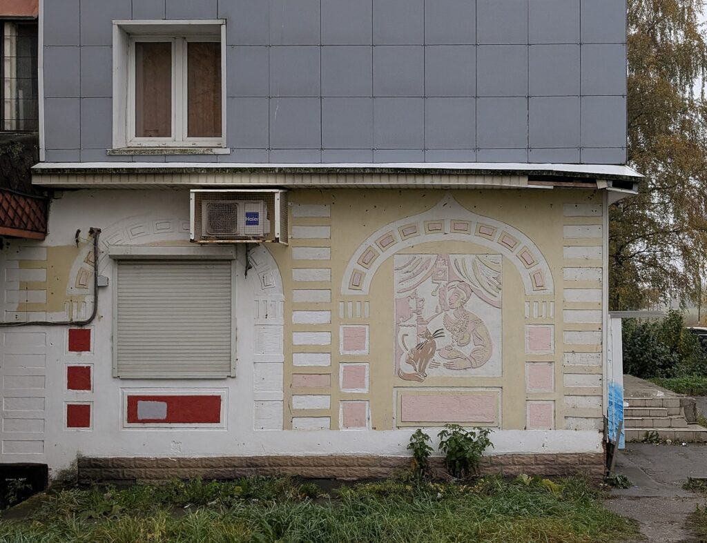 Даже на окраинах в Клину, если внимательно смотреть по сторонам, иногда встречается что-то необычное. Откуда только оно тут взялось? Дом не самый старый — классическая советская многоэтажка, пусть и недавно отремонтированная. Спасибо хоть, что не закрыли сайдингом весь первый этаж, иначе бы мы никогда не узнали о наличии здесь художественной композиции, украшающей торец здания. И будь я один, тоже не увидел бы её, так как привык смотреть в основном вперёд, на дорогу, чтобы не попасть ненароком в аварию. (Но будь я один, то меня бы здесь не было, так что о чём вообще говорить…)