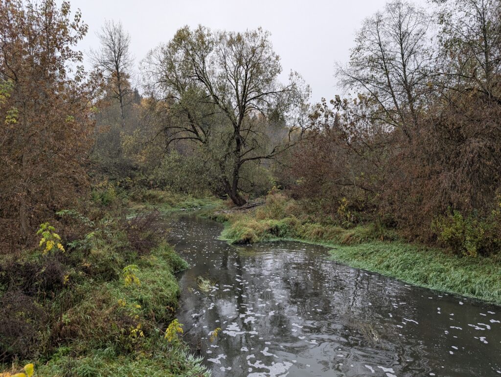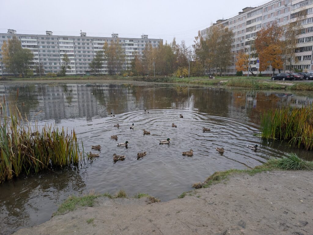 На выезде из города останавливаемся на берегу пруда с утками, для которых у меня опять ничего нет — в следующий раз обязательно исправлю этот момент. Сам пруд тоже представляет определённый интерес, располагаясь почти вплотную к жилым домам, как будто вместо двора. Жить в одном из таких домов было бы привлекательно, если бы не один малюсенький нюанс — почти прямо у нас за спиной проходит Ленинградское шоссе, по которому непрерывно движется интенсивный поток автомобилей… При этом никакой объездной дороги здесь нет — платная магистраль М-11 на эту роль мало подходит.