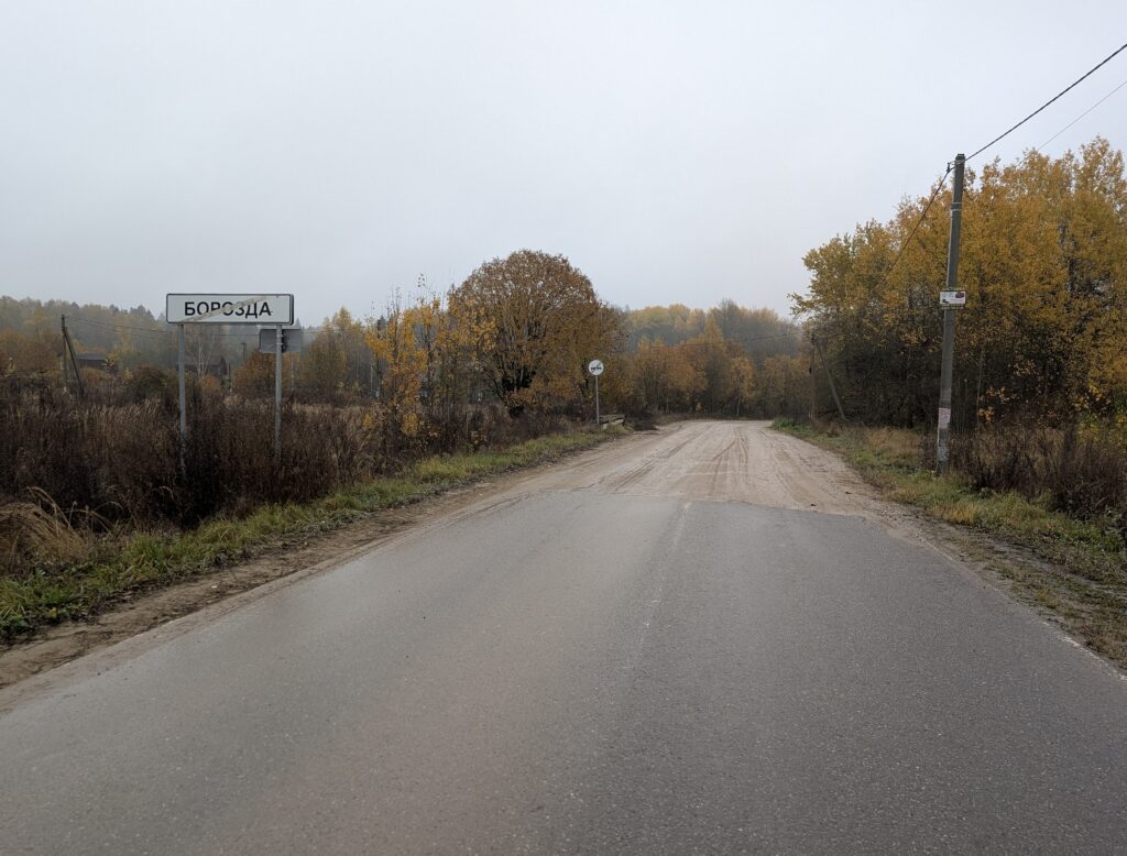 На Ленинградское шоссе мы, конечно же, не выезжаем, пересекая его строго перпендикулярно — в том самом месте, где стоит верстовой столб с заглавного фото. Дорога прямо ведёт в бывший военный городок, где и заканчивается — делать нам там нечего, поэтому сворачиваем направо, в деревню Борозда. Асфальт сменяется щебёнкой — неприятно, но ехать можно, хотя и придётся чуток потрястись. На другом конце деревни вновь появляется ровное дорожное покрытие, но очень скоро этому счастью приходит конец. Вот вам один из тех редких случаев, когда граница цивилизации отчётливо прослеживается на местности.