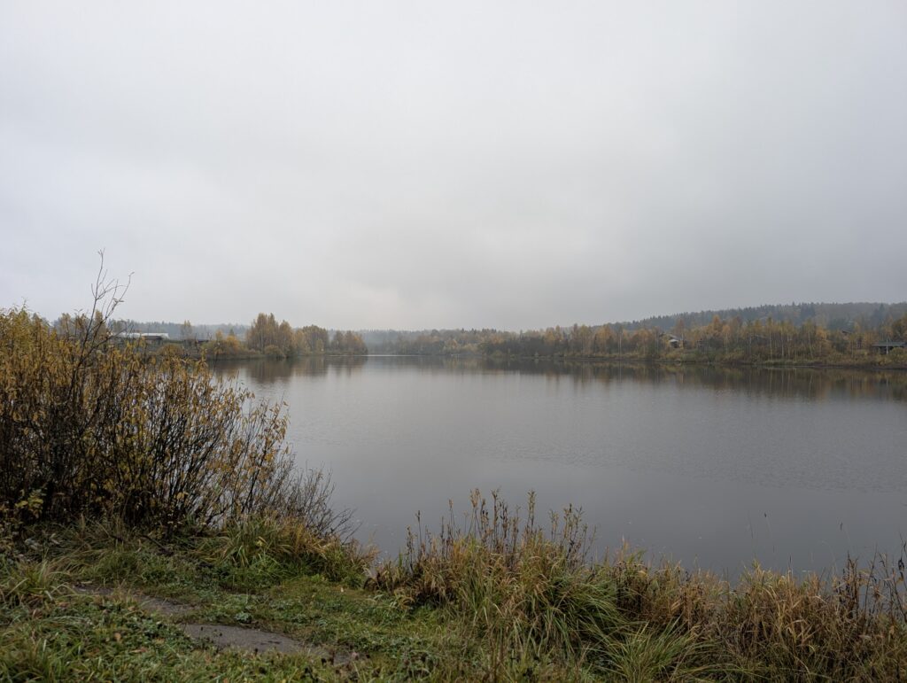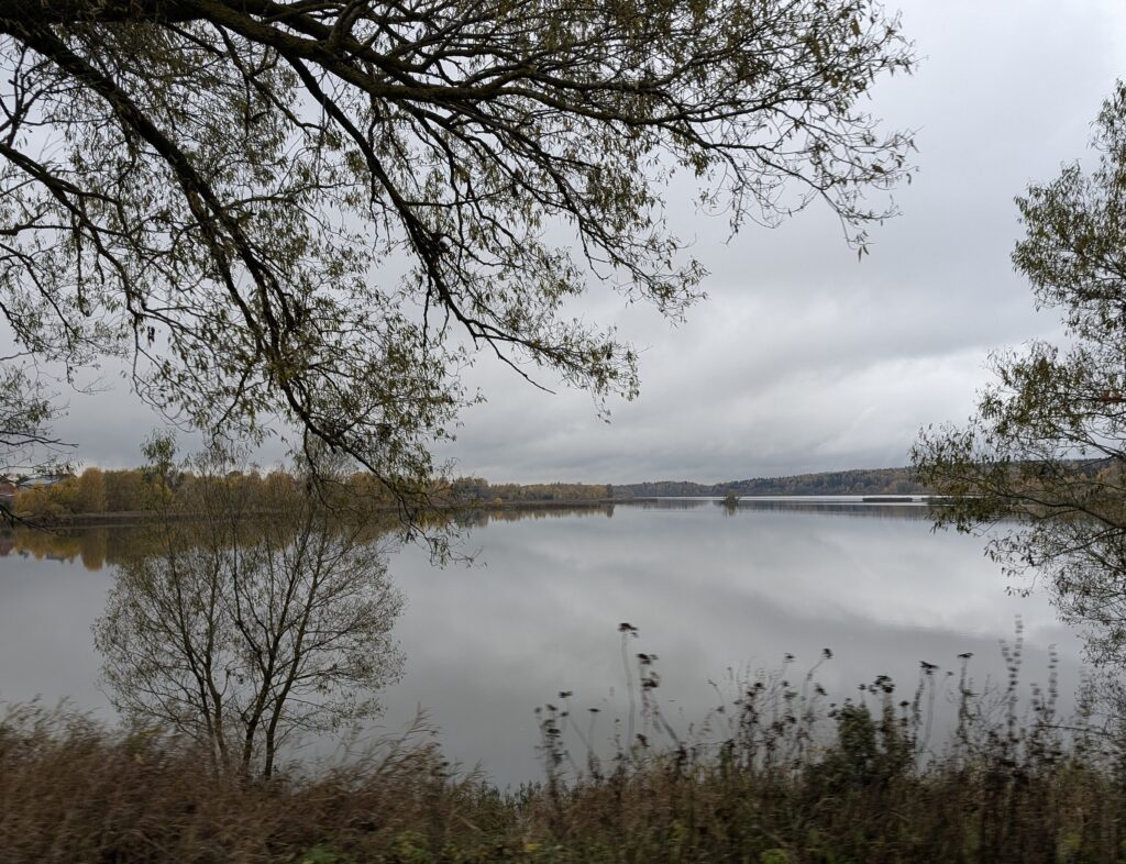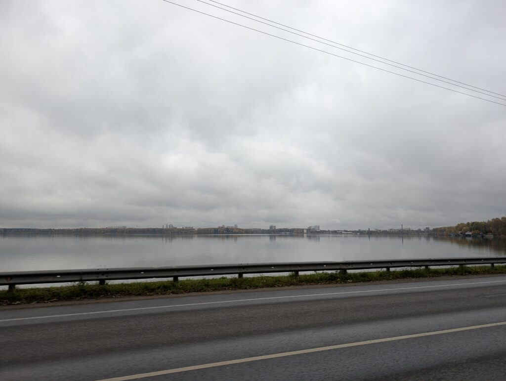 Закончив исследовать руины, разворачиваемся и направляемся обратно в Толстяково, где находится нужный нам поворот. Только бы опять не грязь… К счастью, дорога тут оказывается состоящей в основном из асфальта, пускай и немного разбитого, и в скором времени мы выезжаем на другое шоссе, выводящее нас прямо к озеру Сенеж — одному из крупнейших водоёмов Подмосковья, на противоположном берегу которого просматривается конечный пункт нашего маршрута — город Солнечногорск.
