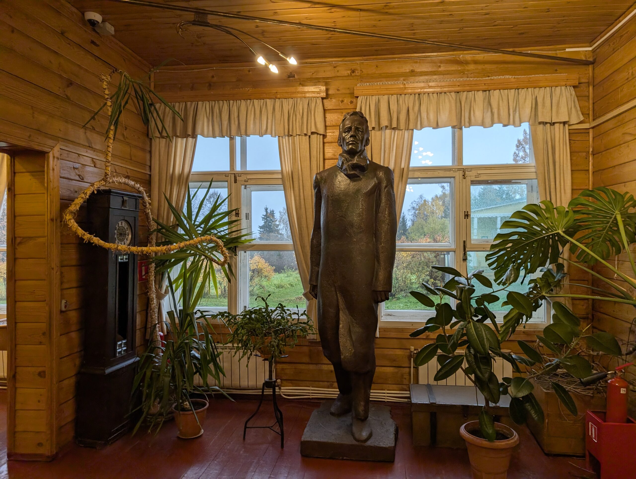 В здании бывшей земской школы размещена музейная экспозиция, посвящённая Блоку — на мой взгляд, она слишком уж масштабная, особенно на контрасте с тем, что сам поэт, насколько я понимаю, посетил усадьбу Тараканово ровно один раз за всю свою жизнь. В широком ассортименте представлены портреты и фотографии писателя, цитаты из его произведений (особенно в этом плане отличилась поэма «Двенадцать») и сохранившиеся с того периода вещи. Вишенка на торте — статуя Блока в натуральную величину. А может, и покрупнее…