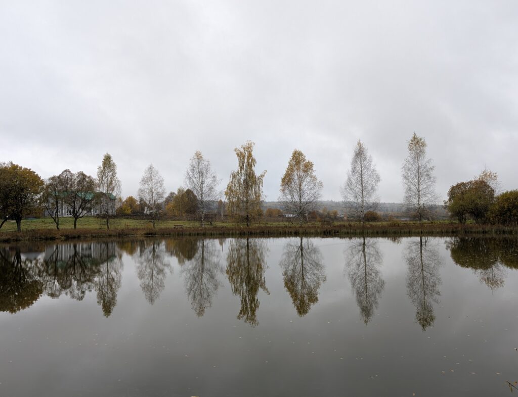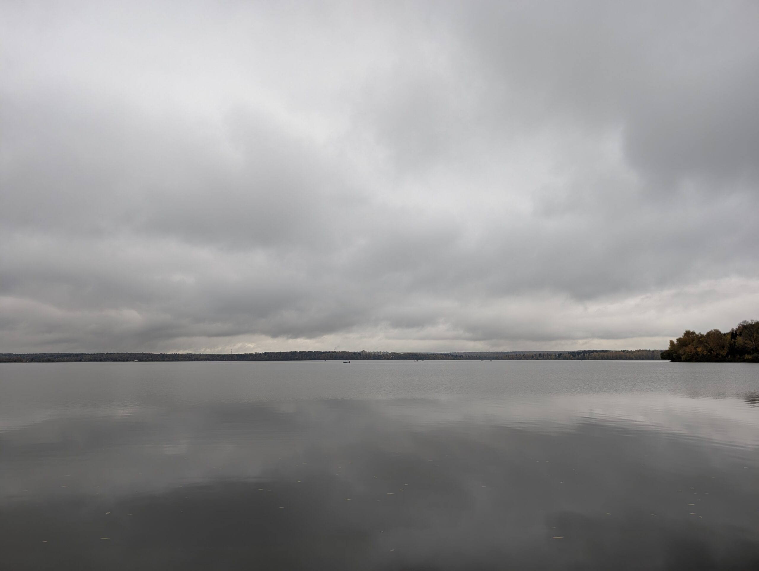 В отражении серой кажется и вода. Прудов в окрестностях немного: после выезда из Клина изначально планировалось заехать к ещё одному водоёму, но сворачивать с плохой дороги на ужасную мы не рискнули. Здесь же подъезд оказался вполне качественным, в том числе и для автомобилей: на них приехали рыбаки, которых я осознанно не включил в кадр, чтобы придать ему атмосферности. А вот кого тут действительно не хватает — так это одинокой чайки, выписывающий круги где-то далеко наверху, под облаками. Маленькая она слишком…