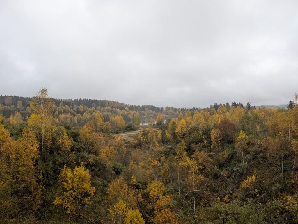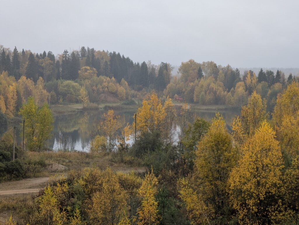 Принимаем решение обозревать карьер на расстоянии, дабы снова не попасть в грязь. Почти весь водоём спрятался где-то далеко за деревьями, перетягивающими всё внимание на себя. Благодаря ярко-жёлтой листве осенний лес выглядит совсем не так, как летний — но в какую сторону это отличие? Лично я считаю, что сравнение в принципе неуместно, так что однозначного ответа нет. Оба варианта красивы по-своему.