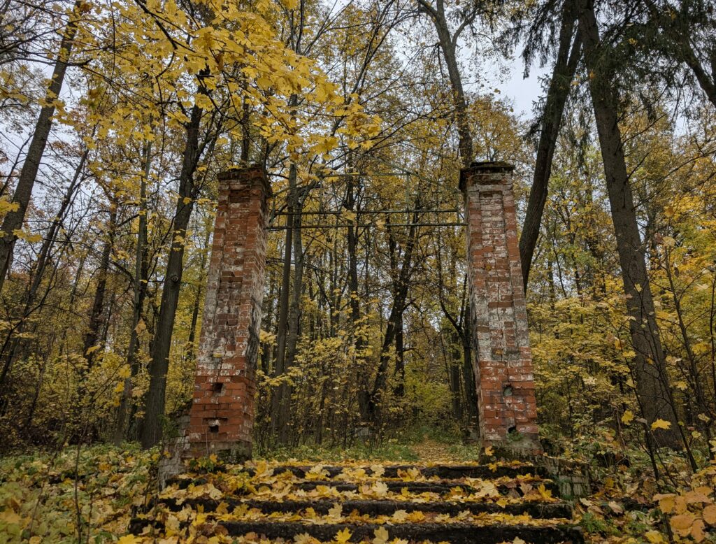 Ворота усадебного парка (а точнее, то, что от них осталось) украшены пятиконечными звёздами — в советское время здесь размещался санаторий, но мне не удалось найти информацию о том, когда именно он прекратил функционировать и по какой конкретно причине это произошло. Наиболее вероятно, что учреждение закрылось вскоре после распада СССР в связи с недостатком финансирования.
