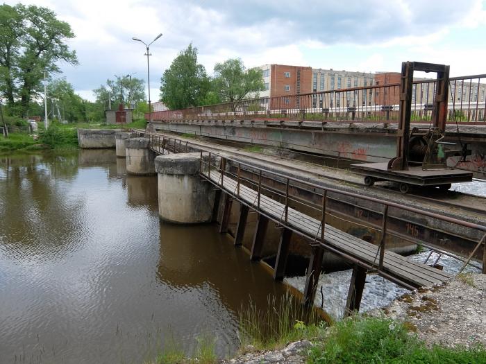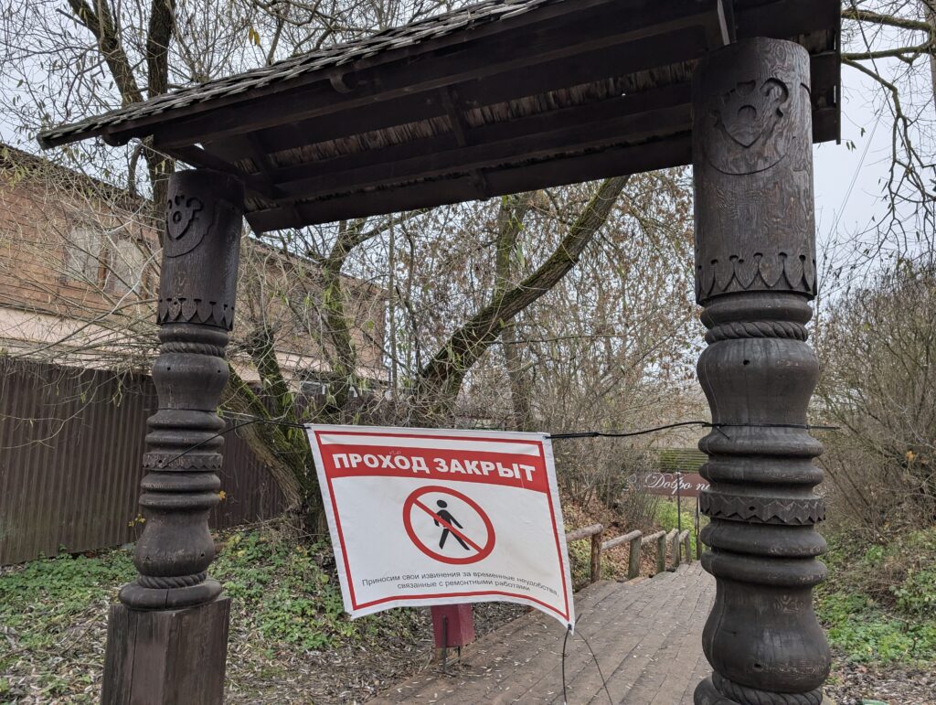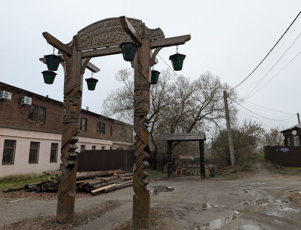 Дорога вдоль озера ведёт нас в центр города, к одному из самых неординарных туристических объектов Киржача — Типографскому пешеходному мосту длиной более 500 метров. Официально заявлено, что это самый длинный пешеходный мост в России! Звучит очень заманчиво… и всё бы ничего, но видите там на заднем плане висящий посередине входной арки плакат? Что-то здесь неладно.