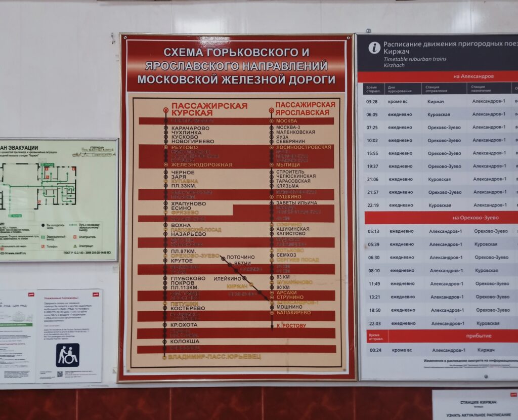 С архитектурной точки зрения вокзал в Киржаче интереса не представляет, зато вот в зале ожидания обнаруживается ценный артефакт древней цивилизации: старинная уникальная схема сразу двух направлений — Ярославского и Горьковского, вместе со связывающим их участком кольца, где, собственно, и находится Киржач. Есть даже касса, но похоже, что совсем недавно она закрылась.