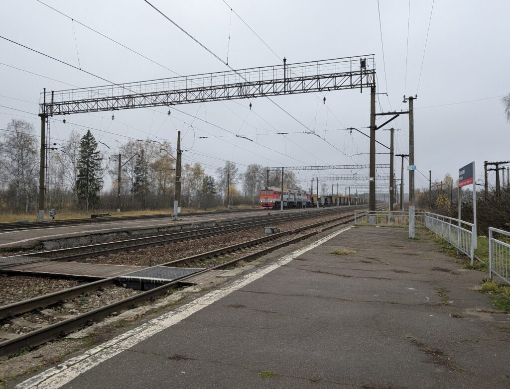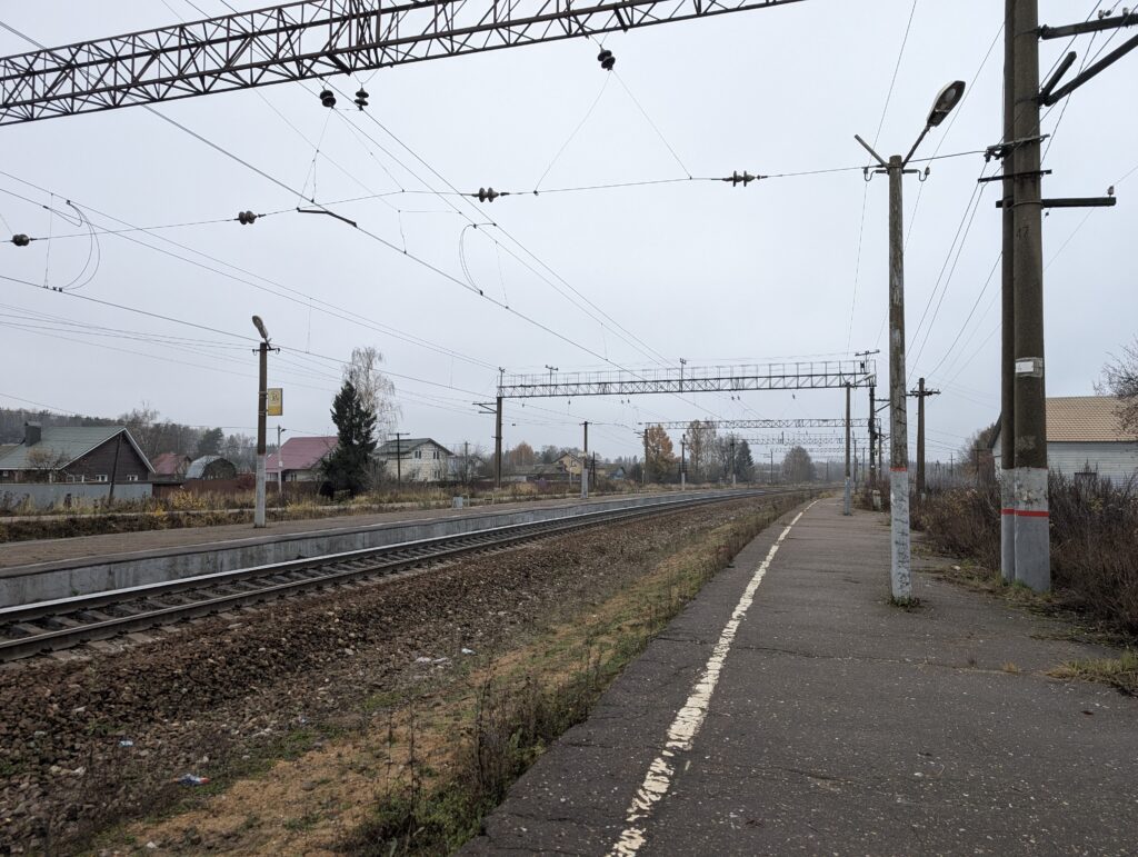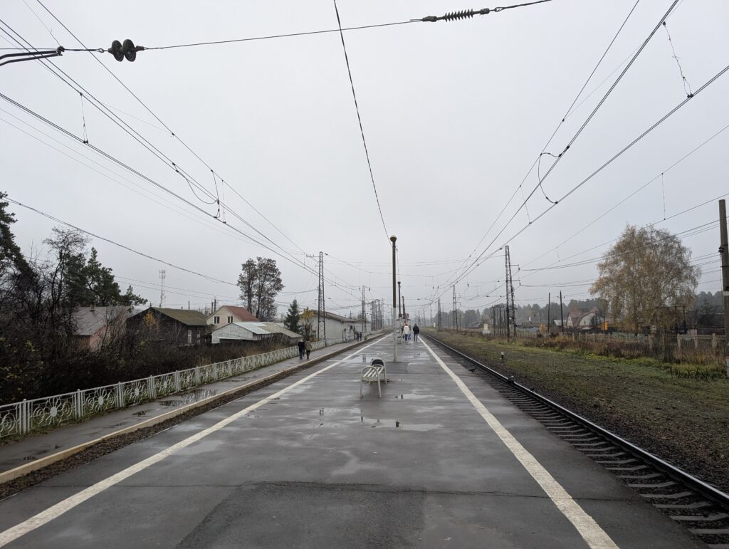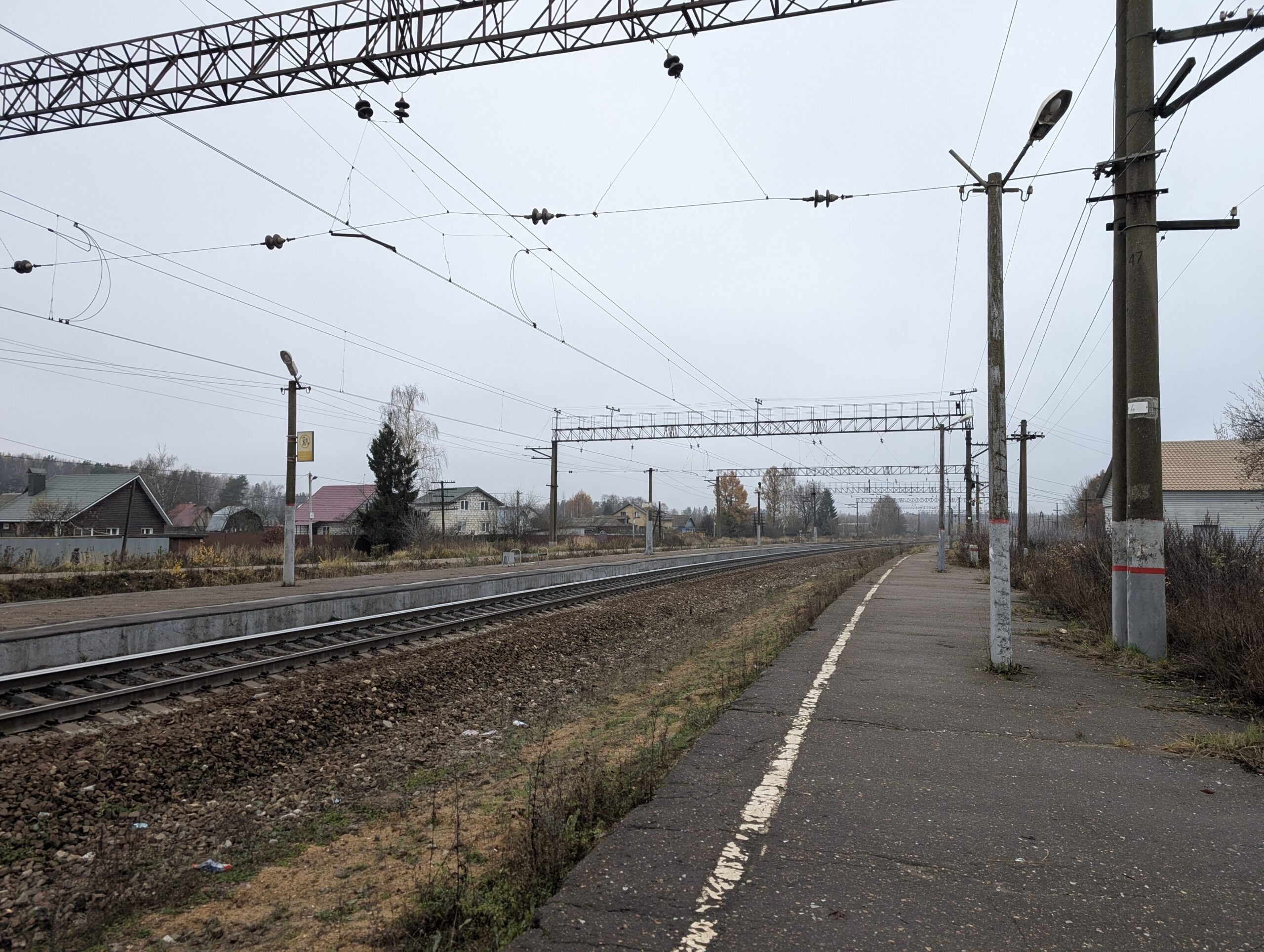 На контрасте, в том самом посёлке картина на первый взгляд намного более удручающая — остатки бывшей железнодорожной станции на фоне невзрачных пятиэтажек. Когда-то давно здесь была платформа, у которой останавливались электропоезда… Но на самом деле не всё так плохо: рельсы никуда не делись, и электропоезда всё так же останавливаются. Просто сняли все боковые пути, и станция превратилась в остановочный пункт без путевого развития.