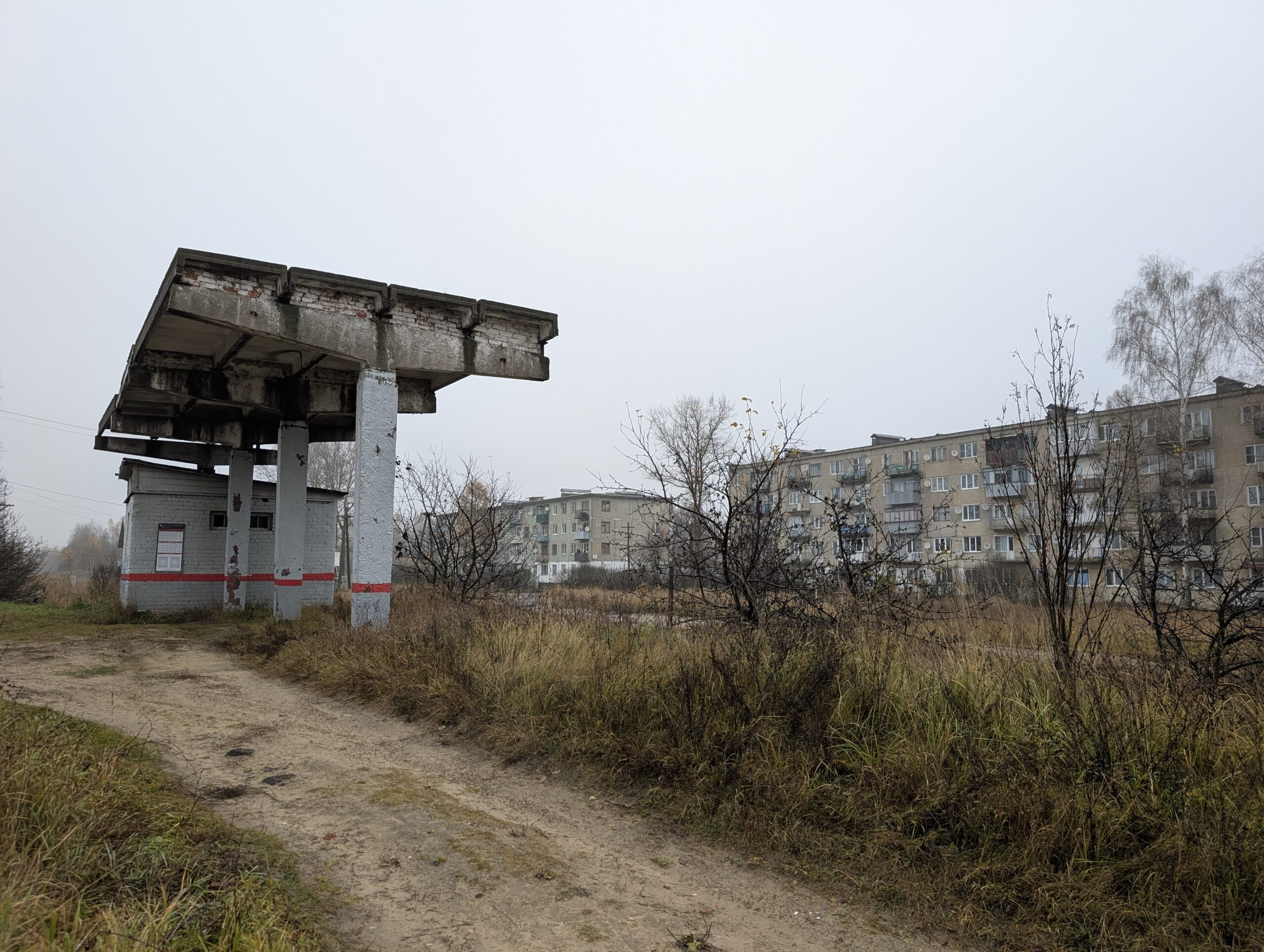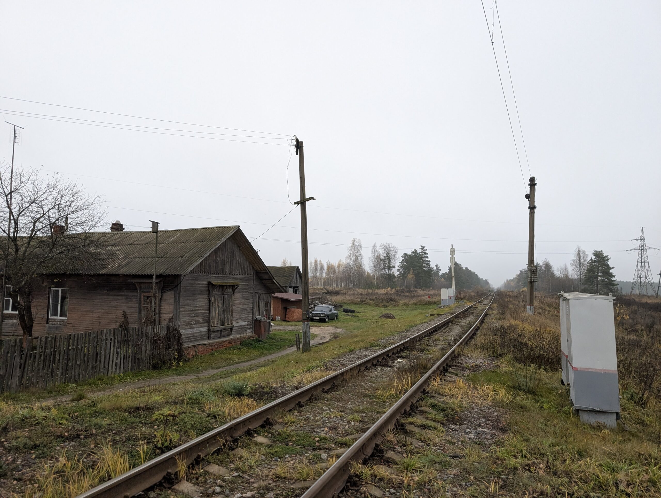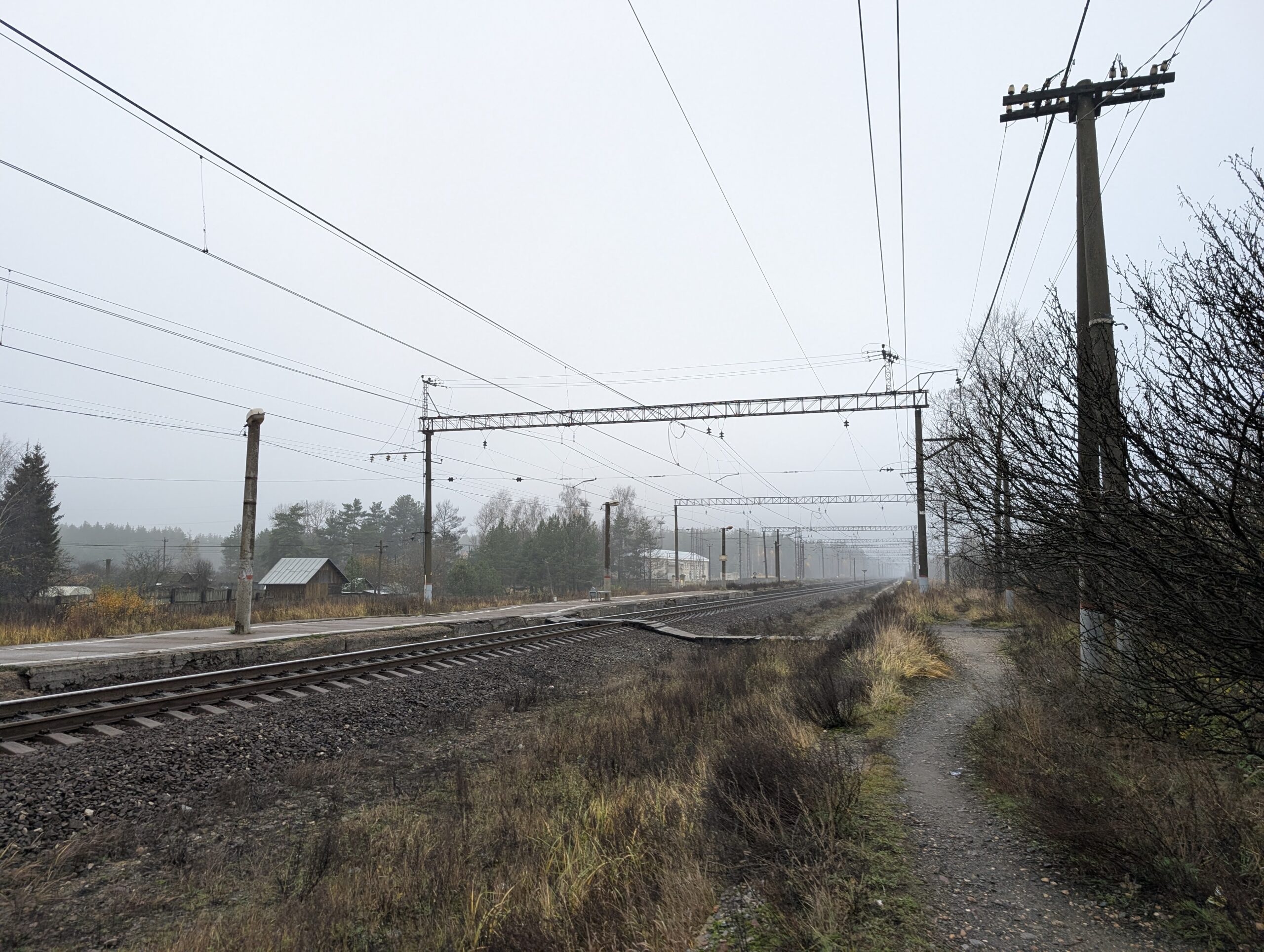 На контрасте, в том самом посёлке картина на первый взгляд намного более удручающая — остатки бывшей железнодорожной станции на фоне невзрачных пятиэтажек. Когда-то давно здесь была платформа, у которой останавливались электропоезда… Но на самом деле не всё так плохо: рельсы никуда не делись, и электропоезда всё так же останавливаются. Просто сняли все боковые пути, и станция превратилась в остановочный пункт без путевого развития.