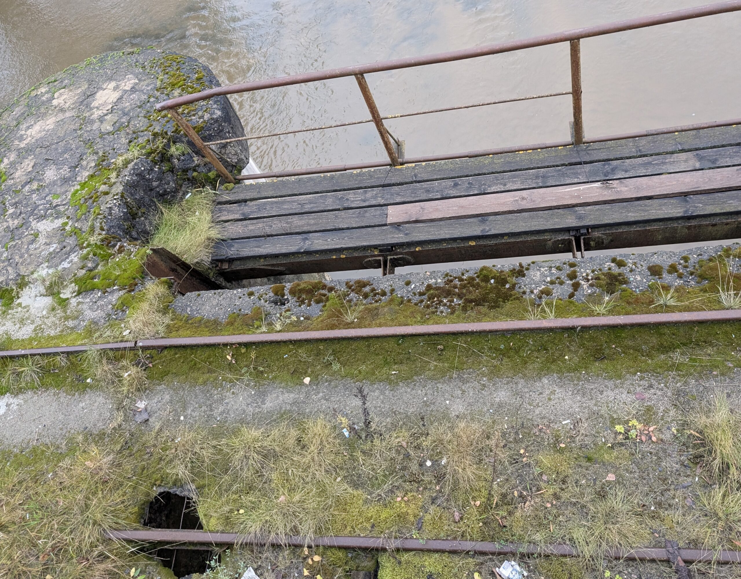Параллельно автомобильному мосту по плотине проходят рельсы — ещё одна загадка, разгадать которую на текущий момент мне не удалось: никаких следов железной дороги ни на том, ни на другом берегу непосредственно рядом с плотиной не наблюдается, да и вообще крайне сомнительно, что конструкция данного гидросооружения смогла бы выдержать тяжёлый локомотив. На одной из фотографий плотины, найденной в Викимапии, заметно, что на рельсах стоит что-то вроде дрезины, но откуда и куда она ездила? И главное — зачем?