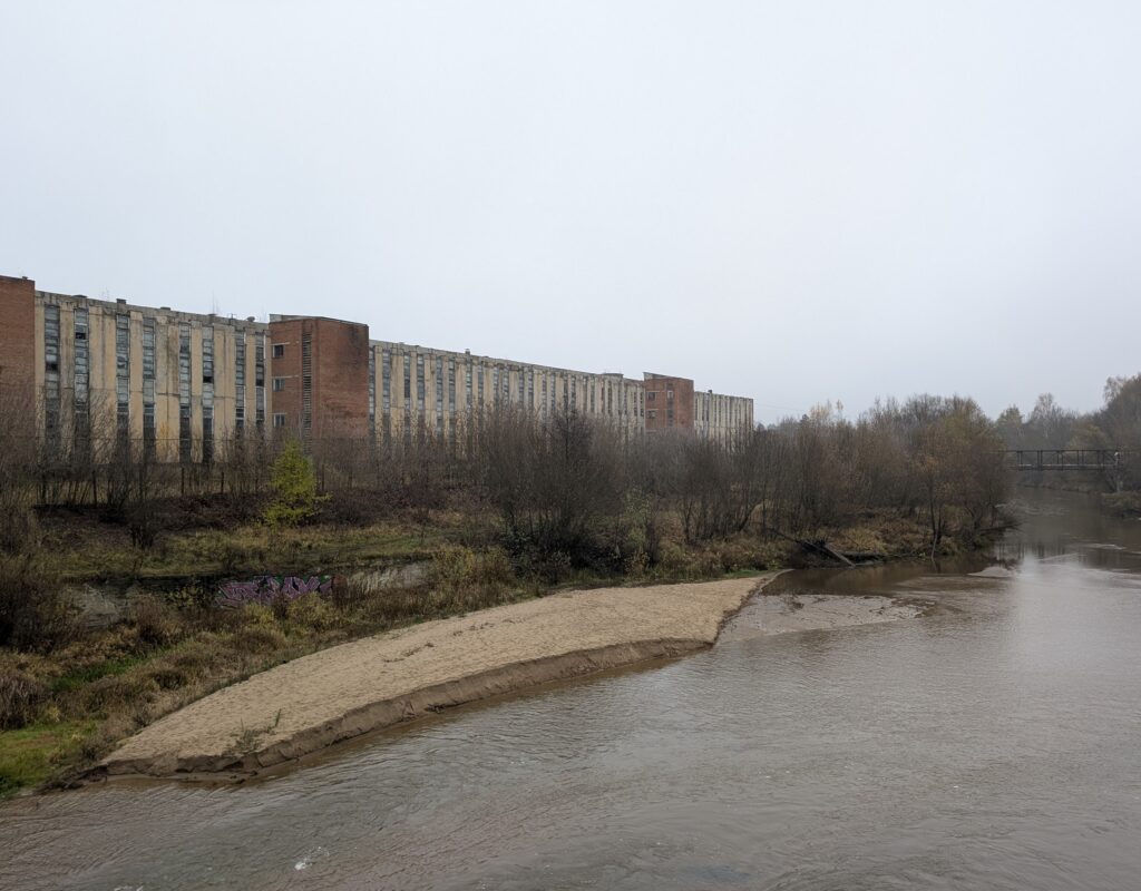С другой стороны моста видна та самая отделочная фабрика, а на переднем плане — небольшой пляж, по понятным причинам абсолютно пустой. Мрачноватый пейзаж… С учётом наличия на противоположном берегу очистных сооружений, почти наверняка сбрасывающих все их «продукты производства» в реку, есть некоторая отличная от нуля вероятность, что и летом здесь не сильно много желающих искупаться.