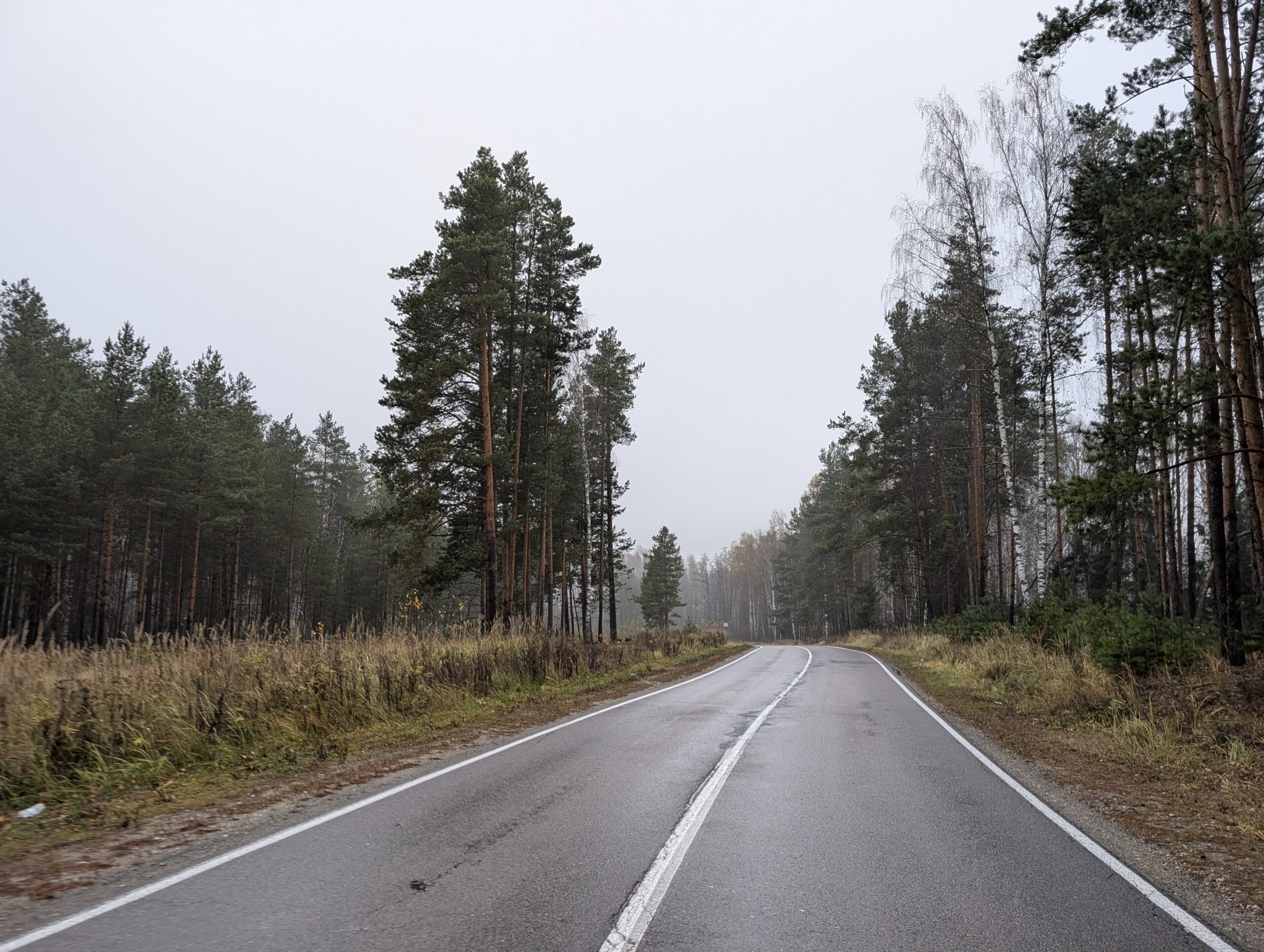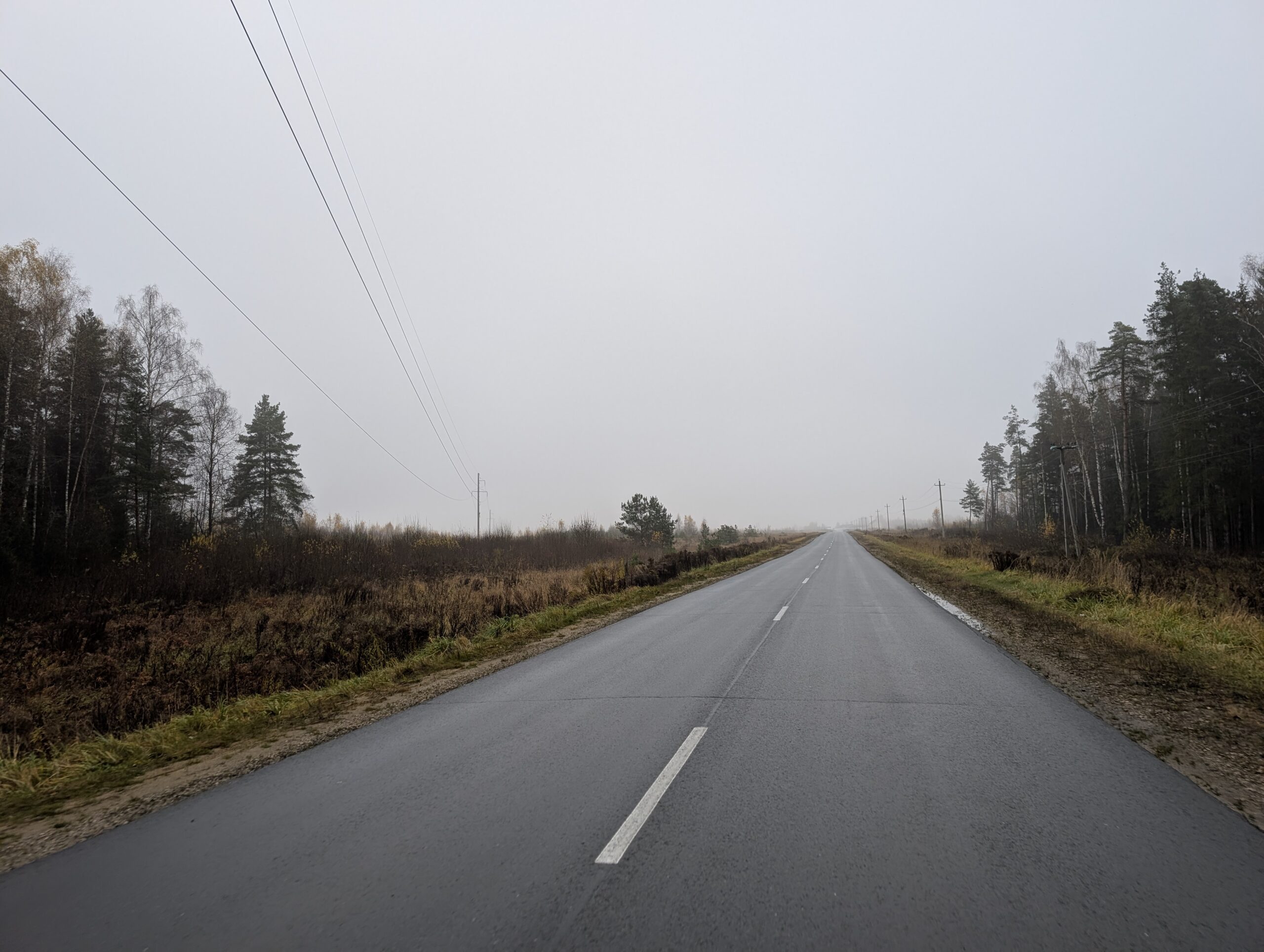Сто метров по узкой тропинке вдоль оживлённой автотрассы — и вот мы снова на тихом, но при этом вполне качественном шоссе, по виду которого даже и не скажешь, что это уже Владимирская область, а не Московская. На самом деле дорога несколько раз пересекает границу областей, так что отдельные её участки лежат именно в столичном регионе, но на местности различия никак не ощущаются. Как и везде к востоку от Москвы, здесь очень много хвойных деревьев, в первую очередь — сосен.