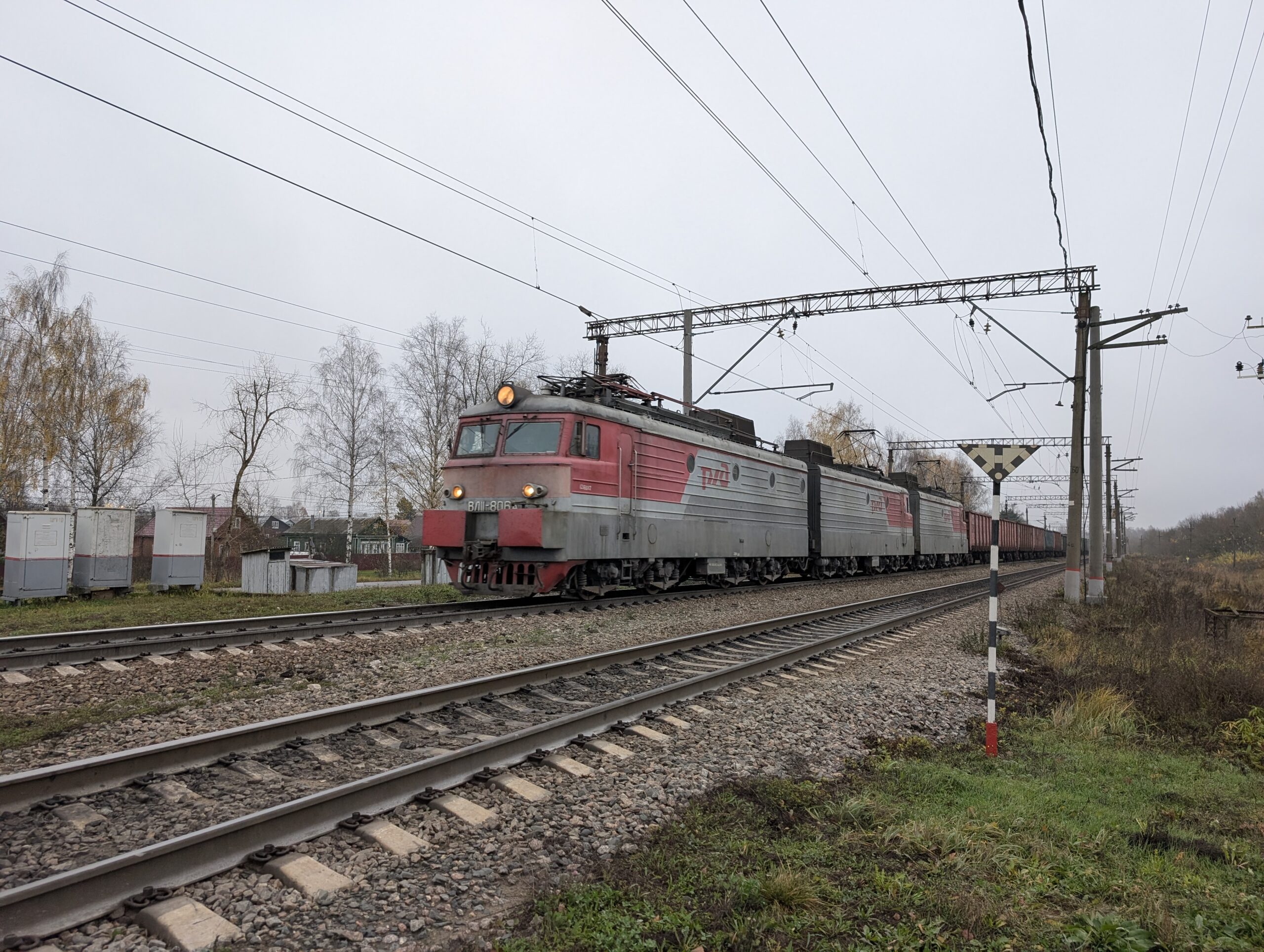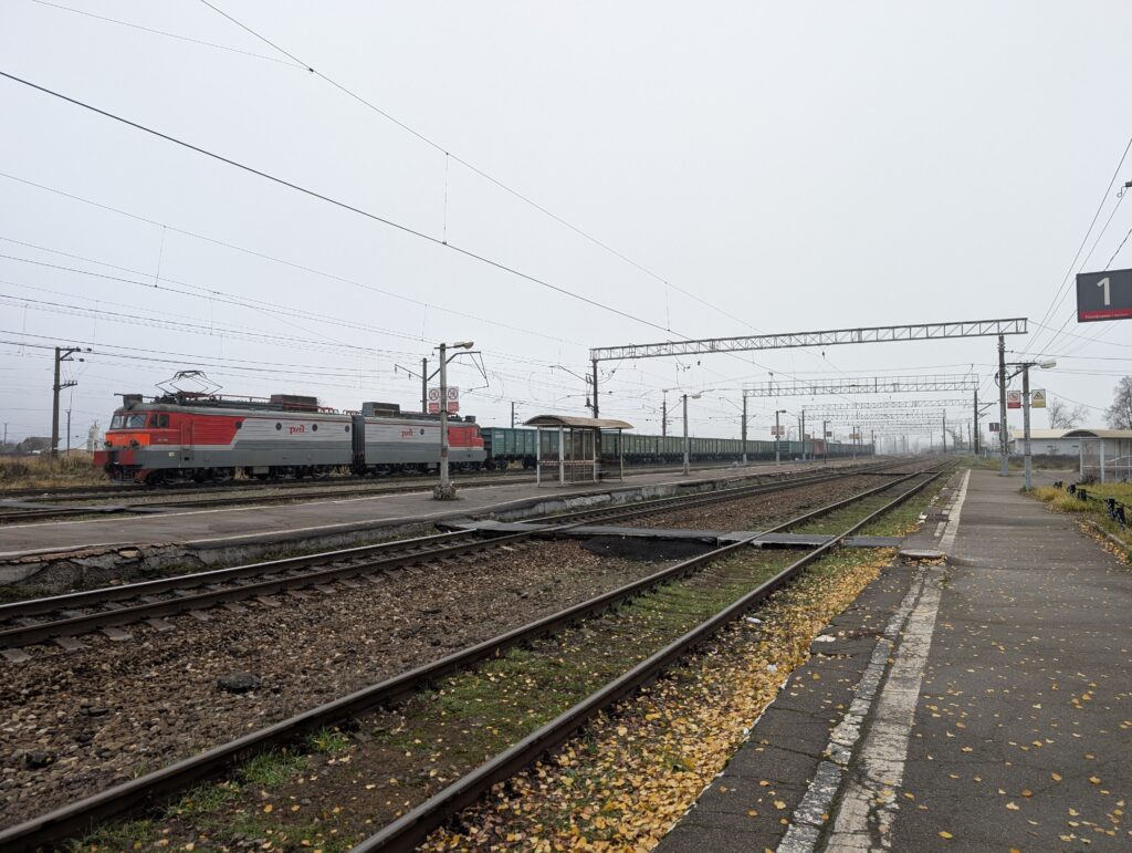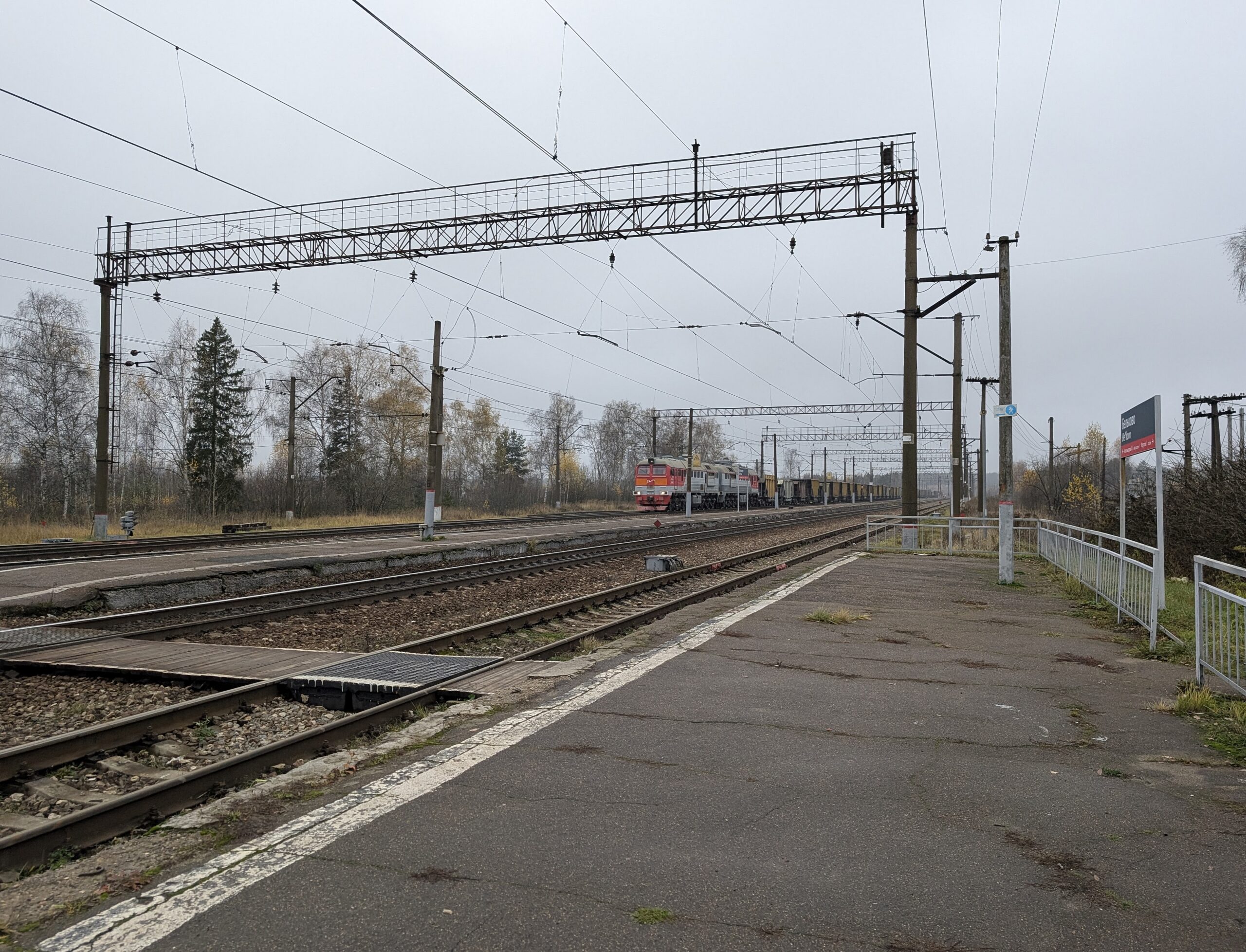 Проехав по всей главной улице, упираемся в переезд, который оказывается закрытым. В направлении Александрова проследует грузовой состав под трёхсекционным электровозом депо Ярославль — вероятнее всего, именно туда он и держит свой путь. Через Ярославль проходит не только северный ход Транссиба, но ещё и грузовой маршрут из Москвы в Санкт-Петербург: по главному ходу Октябрьской дороги грузовое движение ограничено в угоду пассажирскому.