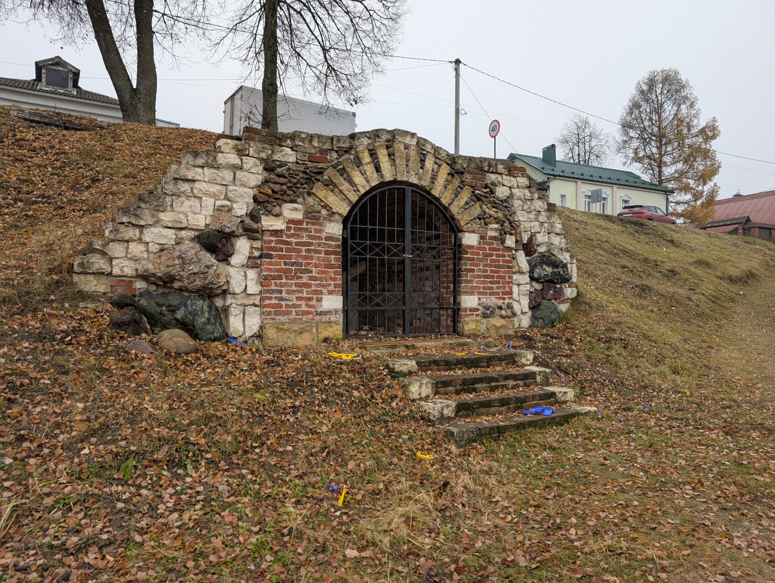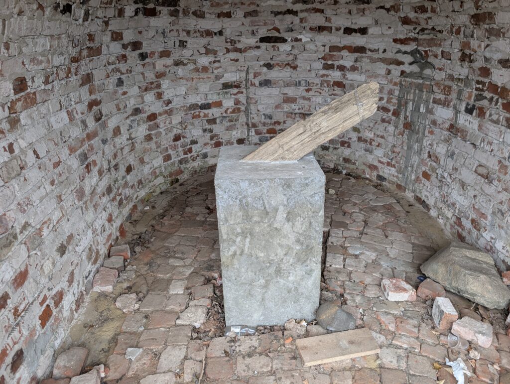А неподалёку отсюда спрятался… нет, вовсе не заяц, а что-то очень странное. Внешне оно похоже на какой-то грот или склеп, только внутри там не гроб, а загадочная конструкция неизвестного назначения, представляющая собой бетонный блок с вмурованной в него деревяшкой. Определить смысл данной инсталляции будет, пожалуй, даже сложнее, чем понять, зачем были нужны те рельсы на плотине в Городищах…