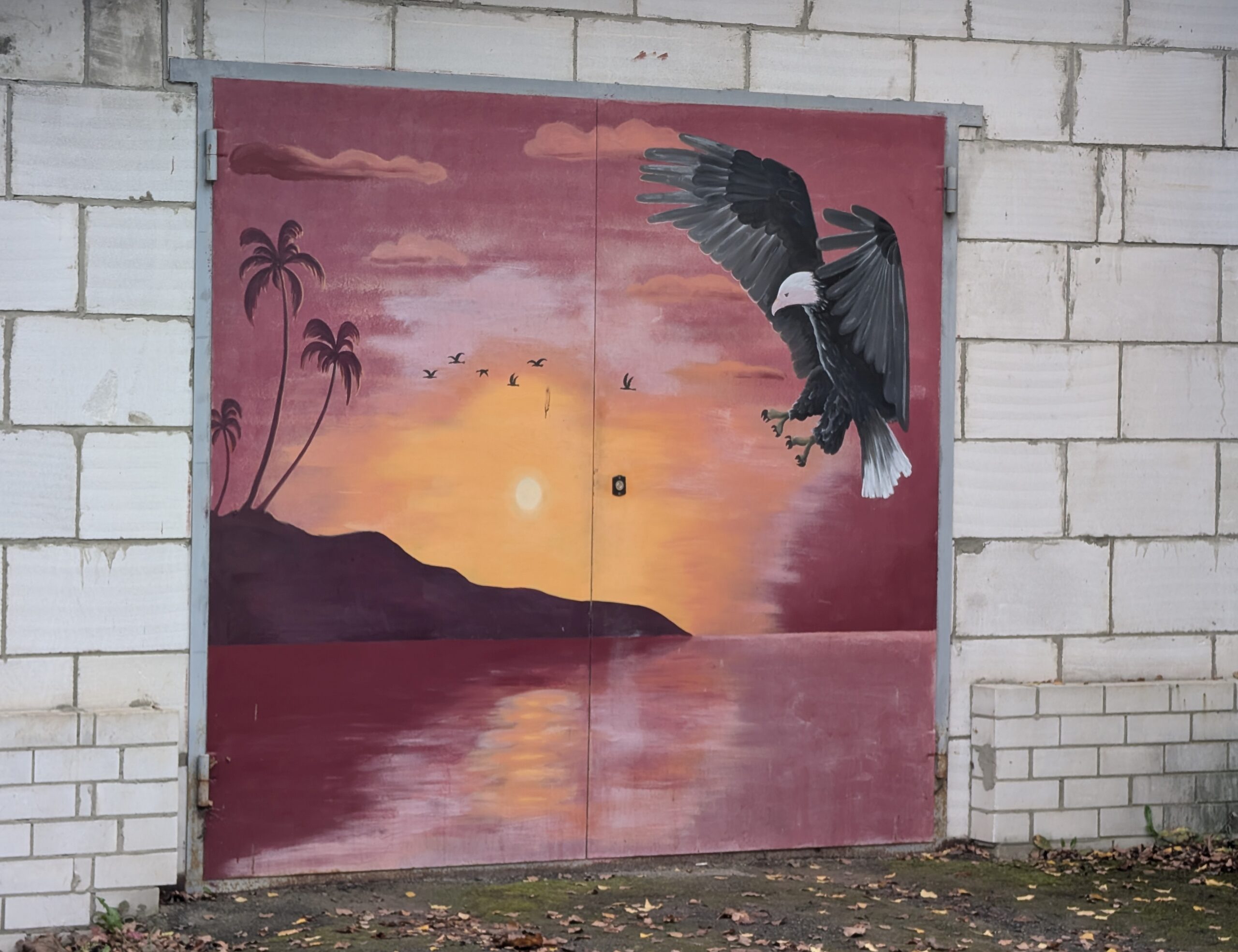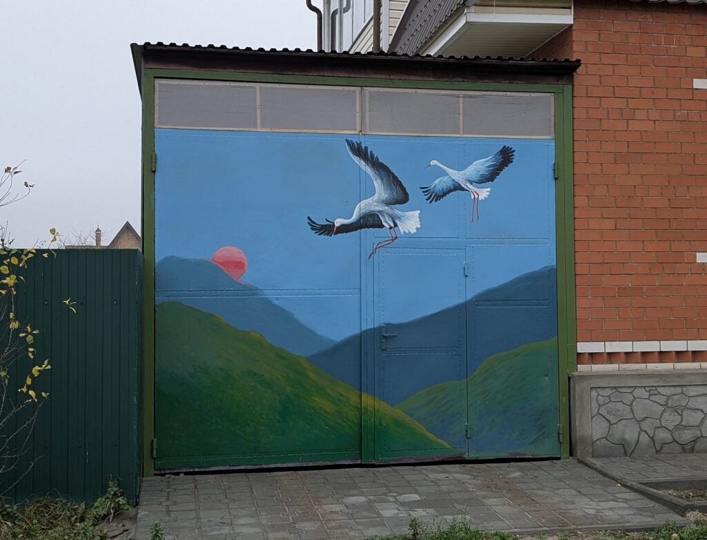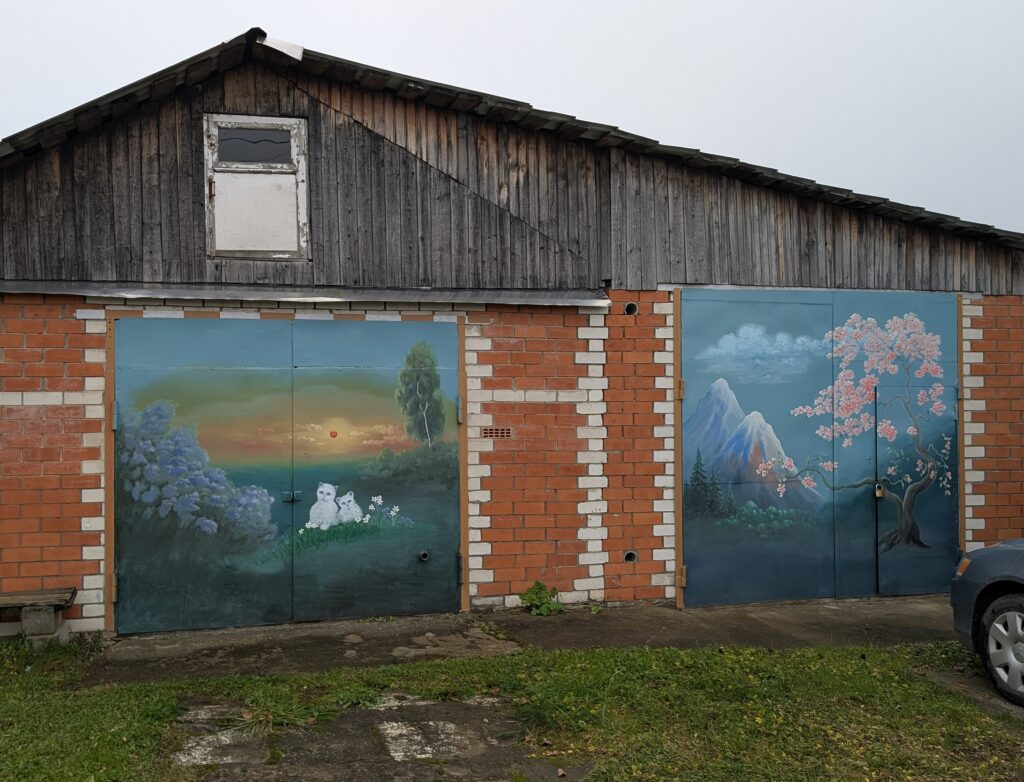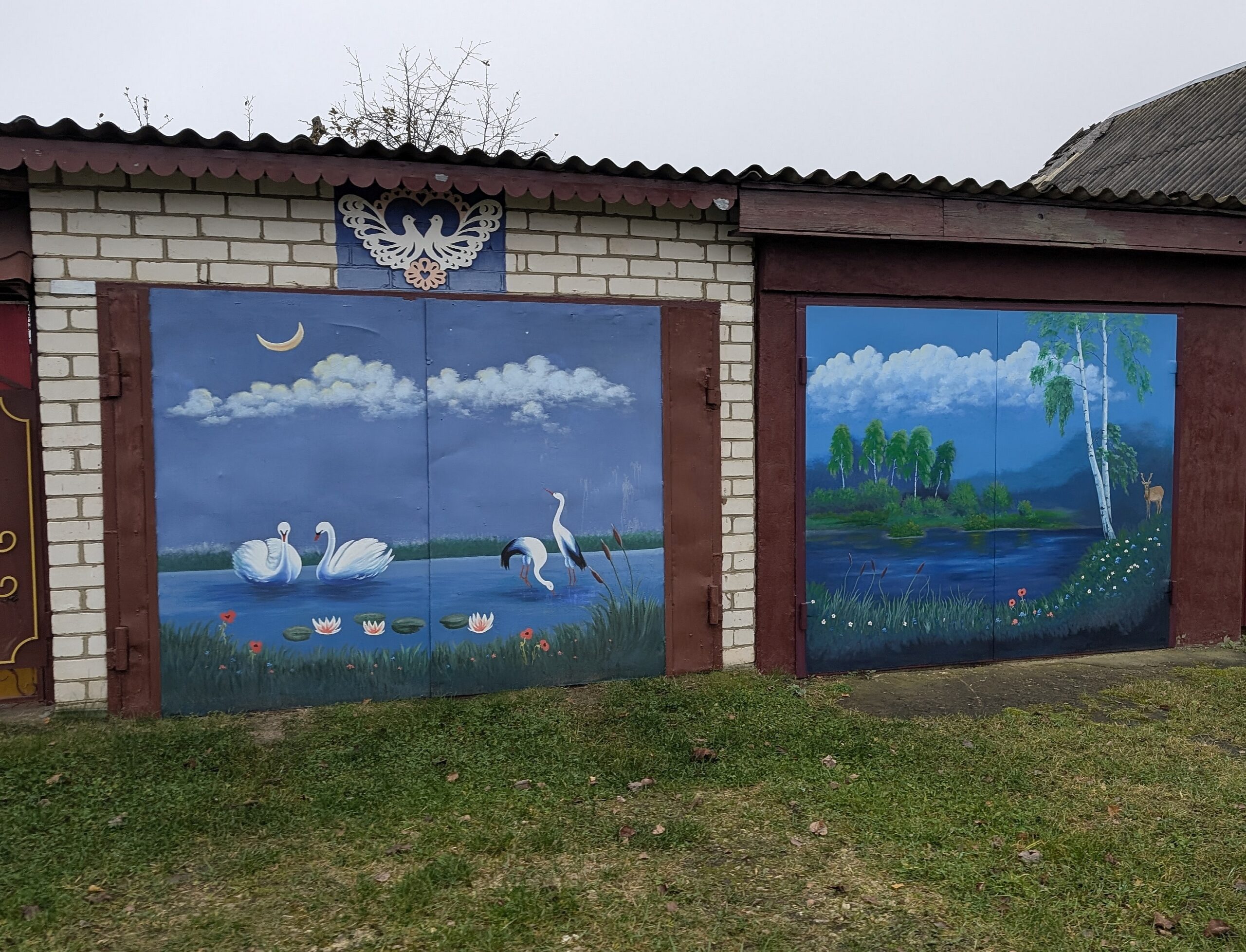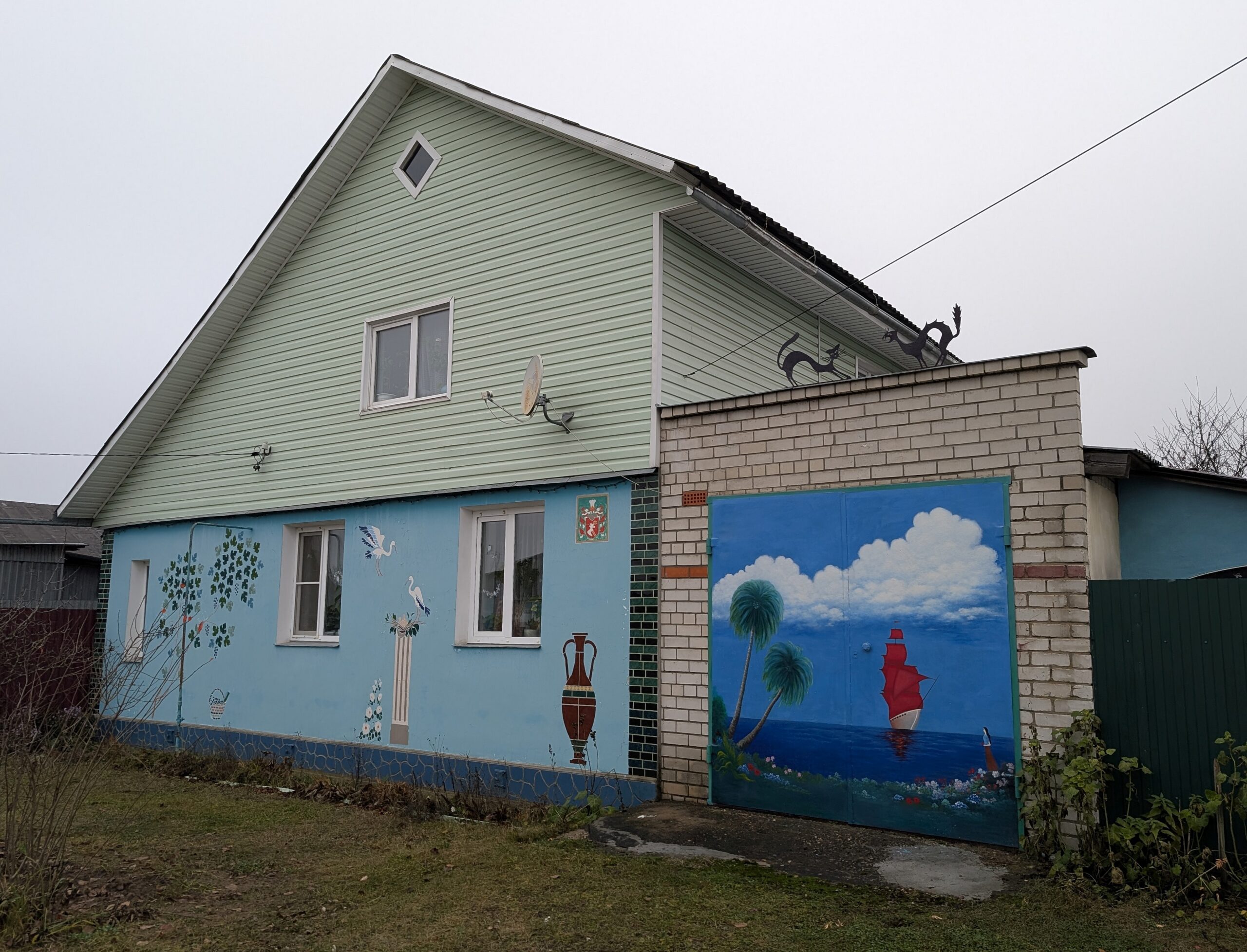 Однако церковь, пусть и старинная — вполне рядовое явление даже в мелких городках. Совсем другое дело — стрит-арт: найти его здесь я никак не ожидал, и всё же оказалось, что он в Киржаче есть, причём далеко не в единичном экземпляре! И место необычное — улица в частном секторе. Раскрашены в основном ворота гаражей, не иначе как по согласованию с их владельцами.