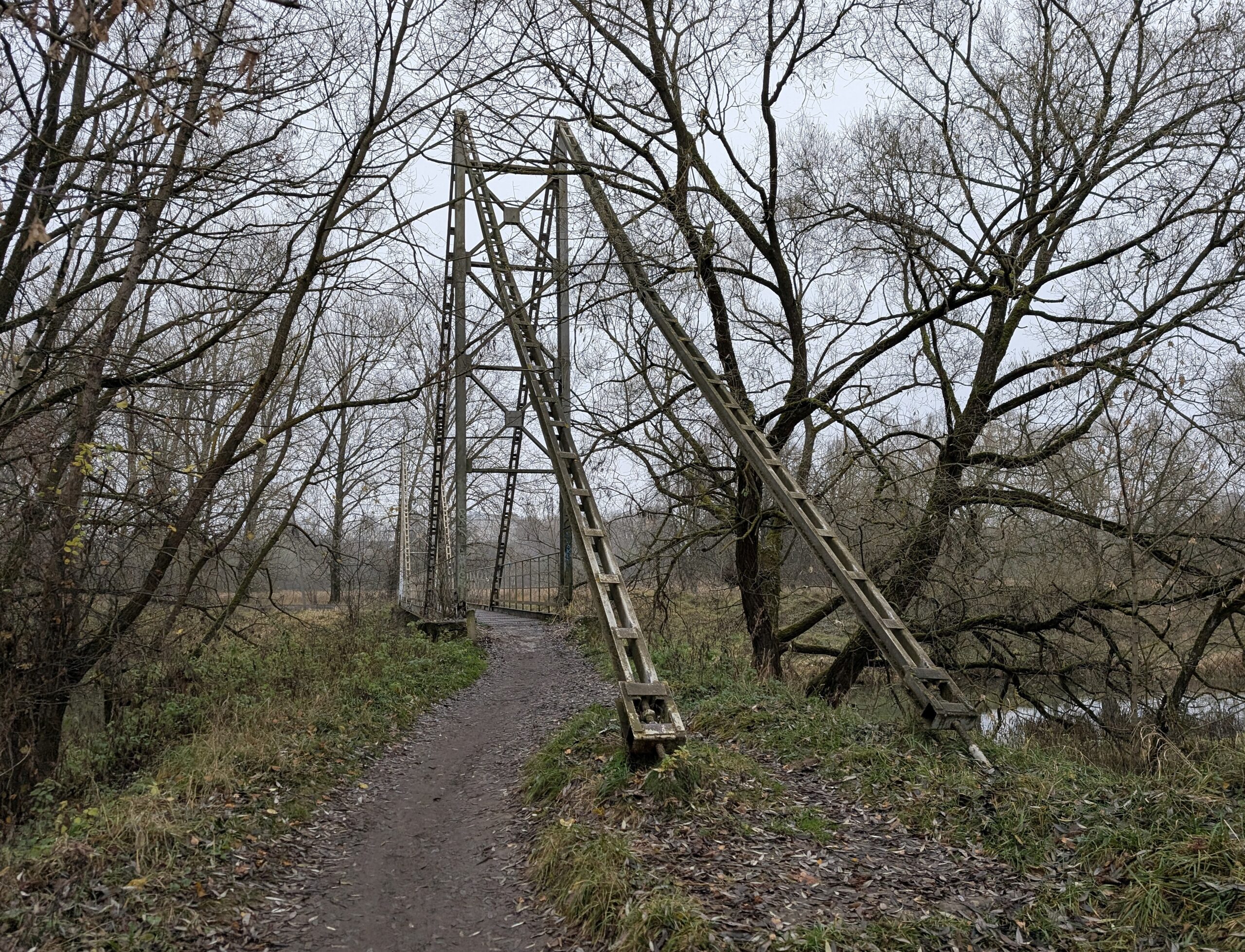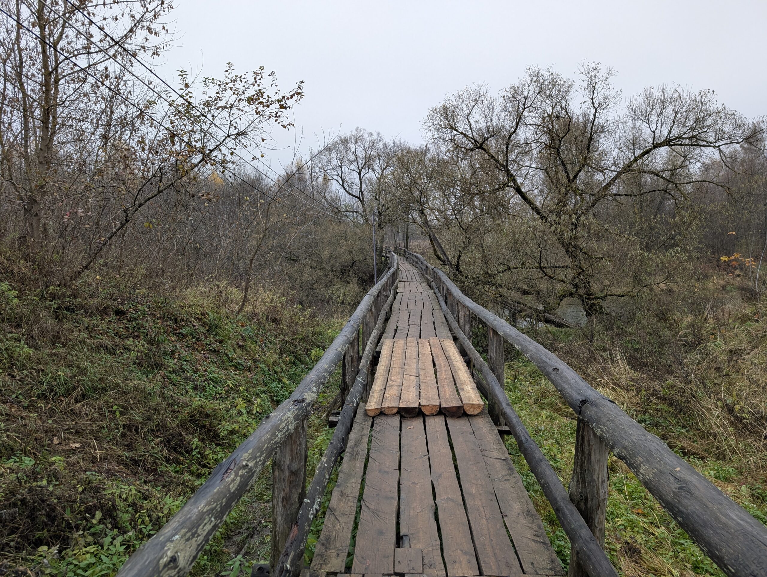 Весь мост целиком сделан из дерева, вследствие чего в сырую погоду он довольно скользкий — этим он немного напоминает деревянную дорожку в парке в моём районе, где наблюдаются схожие проблемы. Ремонт, судя по всему, заключается в частичной замене подгнивших досок на новые — если так, то пройти по мосту до конца не составит труда. Впереди прорисовывается река — это всё тот же Киржач. (А куда ему деться-то?)