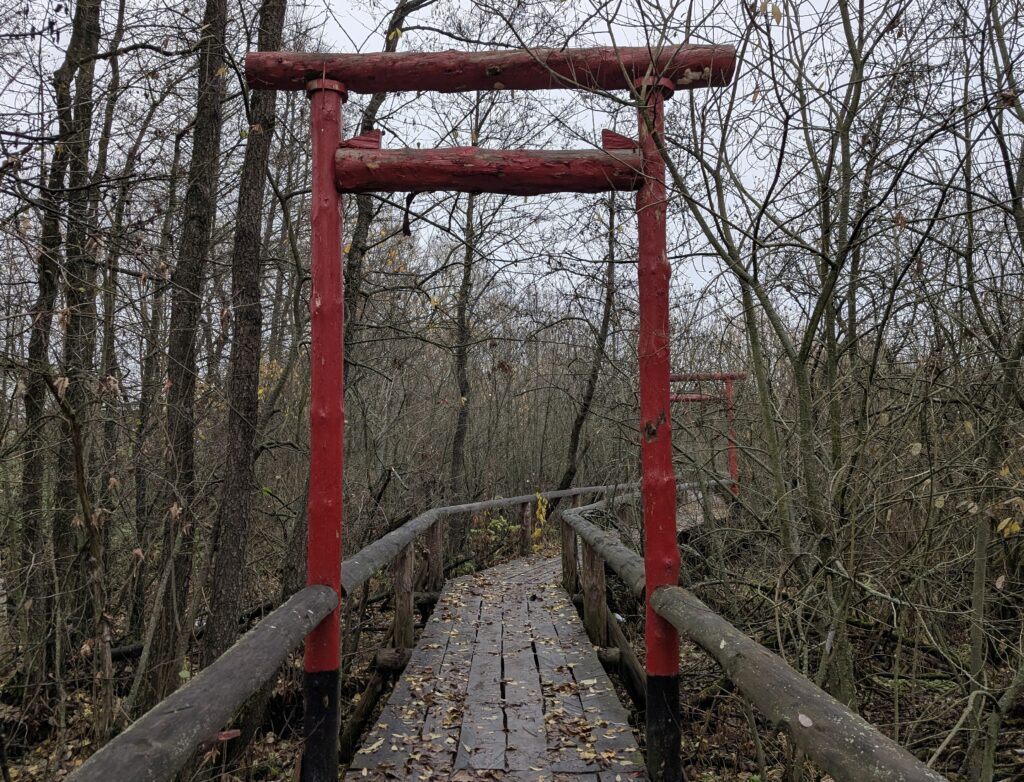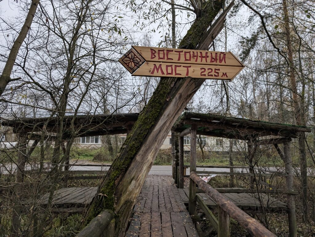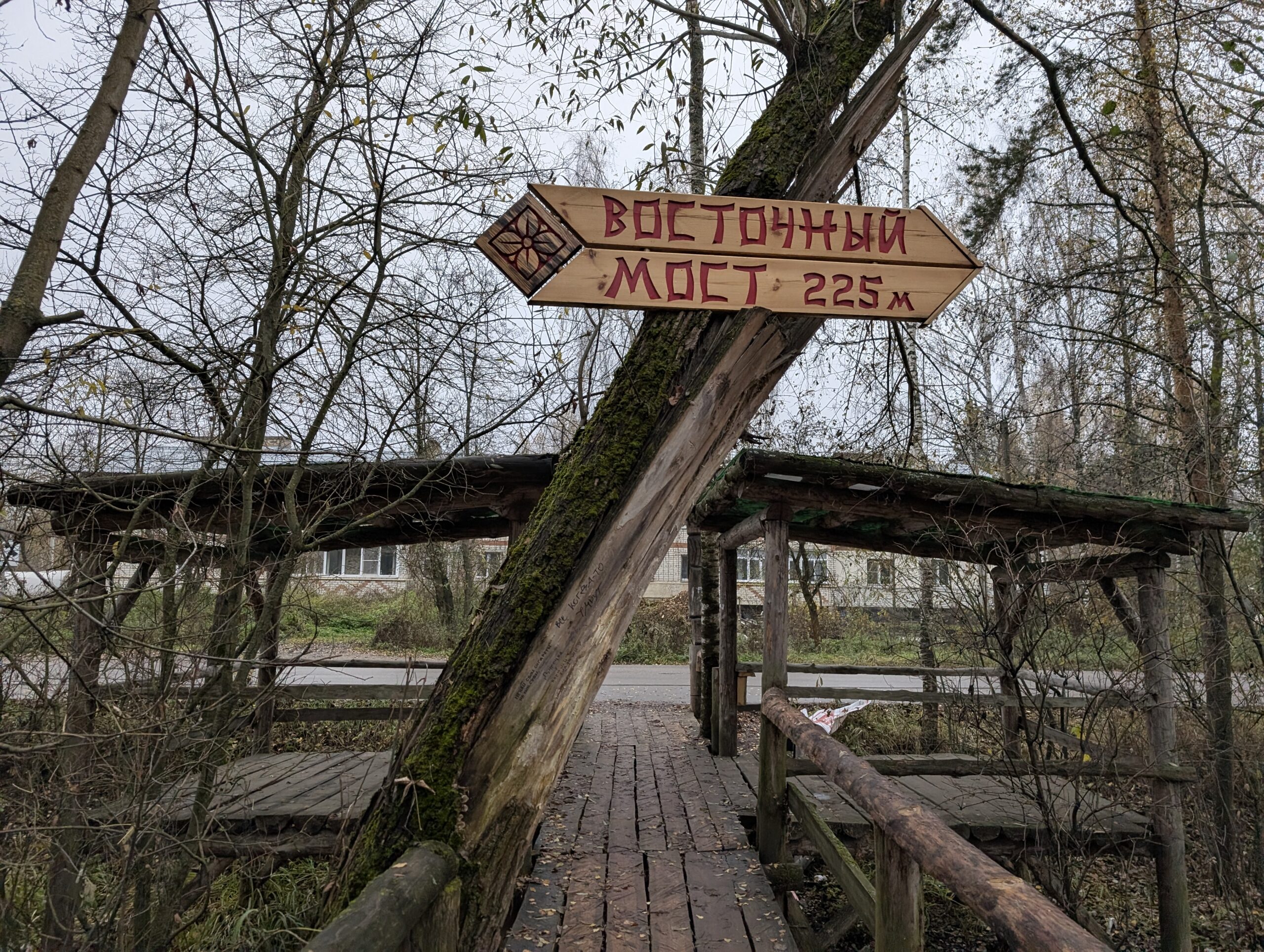В отличие от Типографского моста, идущего почти строго прямо на всём его протяжении, за исключением лишь небольшого изгиба в районе поляны утерянных букв, Восточный мост сильно изогнут и на карте имеет форму ломаной линии — не исключаю, что это тоже может быть часть японской эстетики. Помимо эстетической, мост также отлично справляется и со своей основной функцией, выводя своих посетителей на территорию единственного в нашей стране музея ледниковых камней, основанного в 2020 году.
