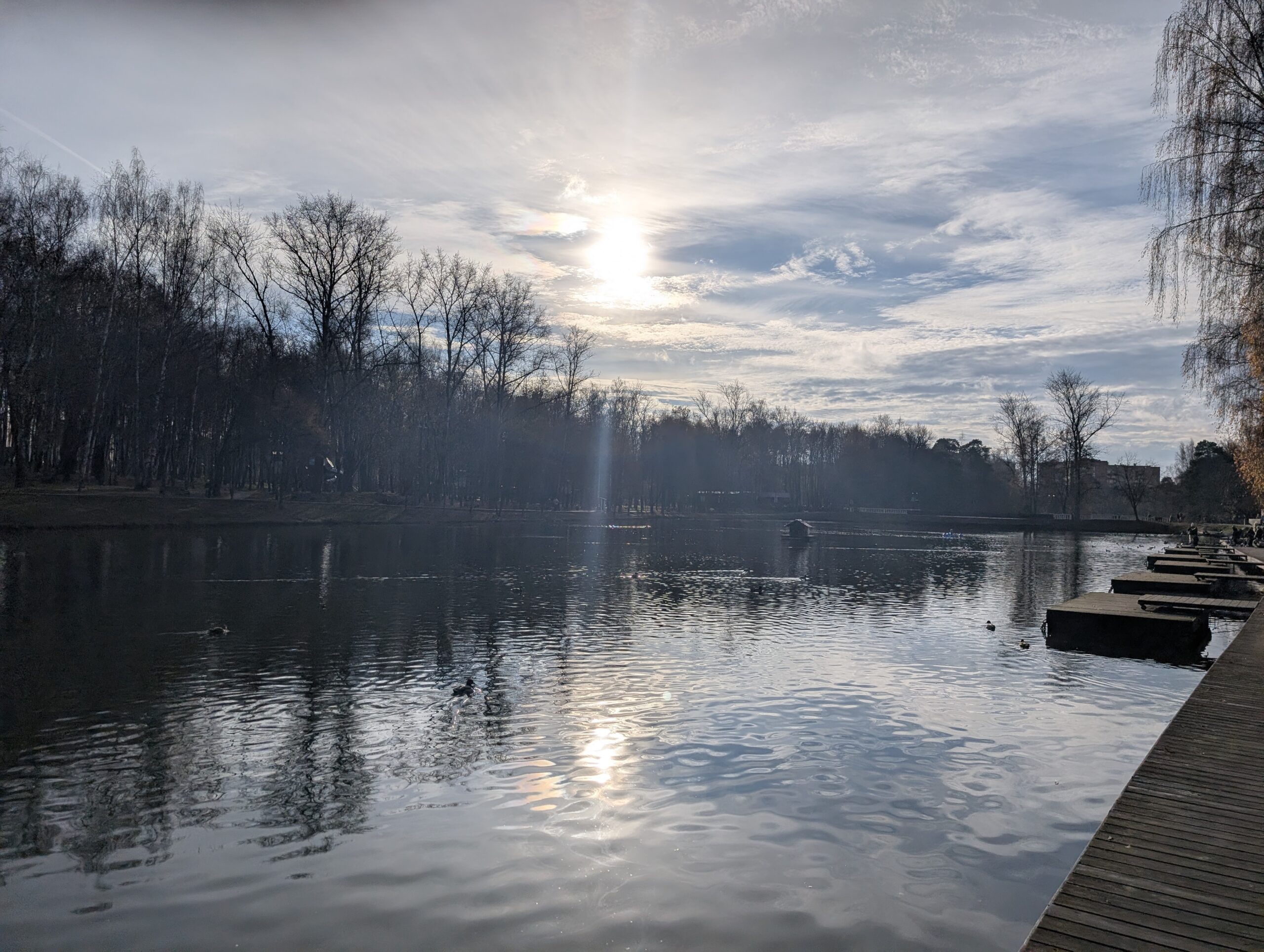 В Красногорске я бываю редко, но с Ивановскими прудами прежде уже сталкивался в ходе прошлогодней поездки на Лохин остров, когда мне под конец пришлось убегать от стремительно наступающего вечернего ливня. Странно, но несмотря на наличие автоматов с кормом, уток здесь немного. А вот в небольшом сквере в микрорайоне Чернево, где тоже есть свой пруд, я повстречал гораздо более крупную стаю водоплавающих — и это при том, что весь сквер вместе с водоёмом по площади не превосходит даже одного из тех самых Ивановских прудов.