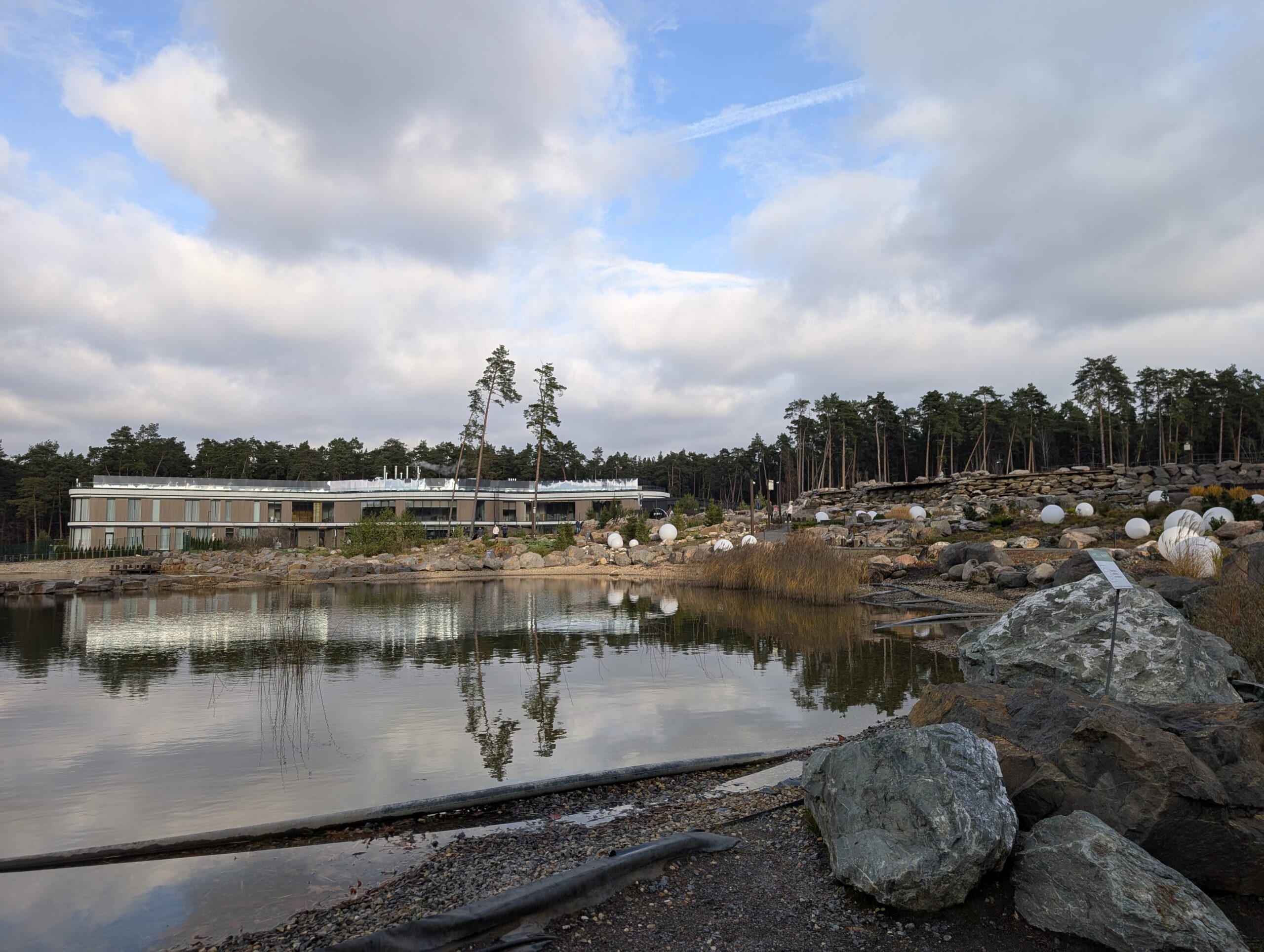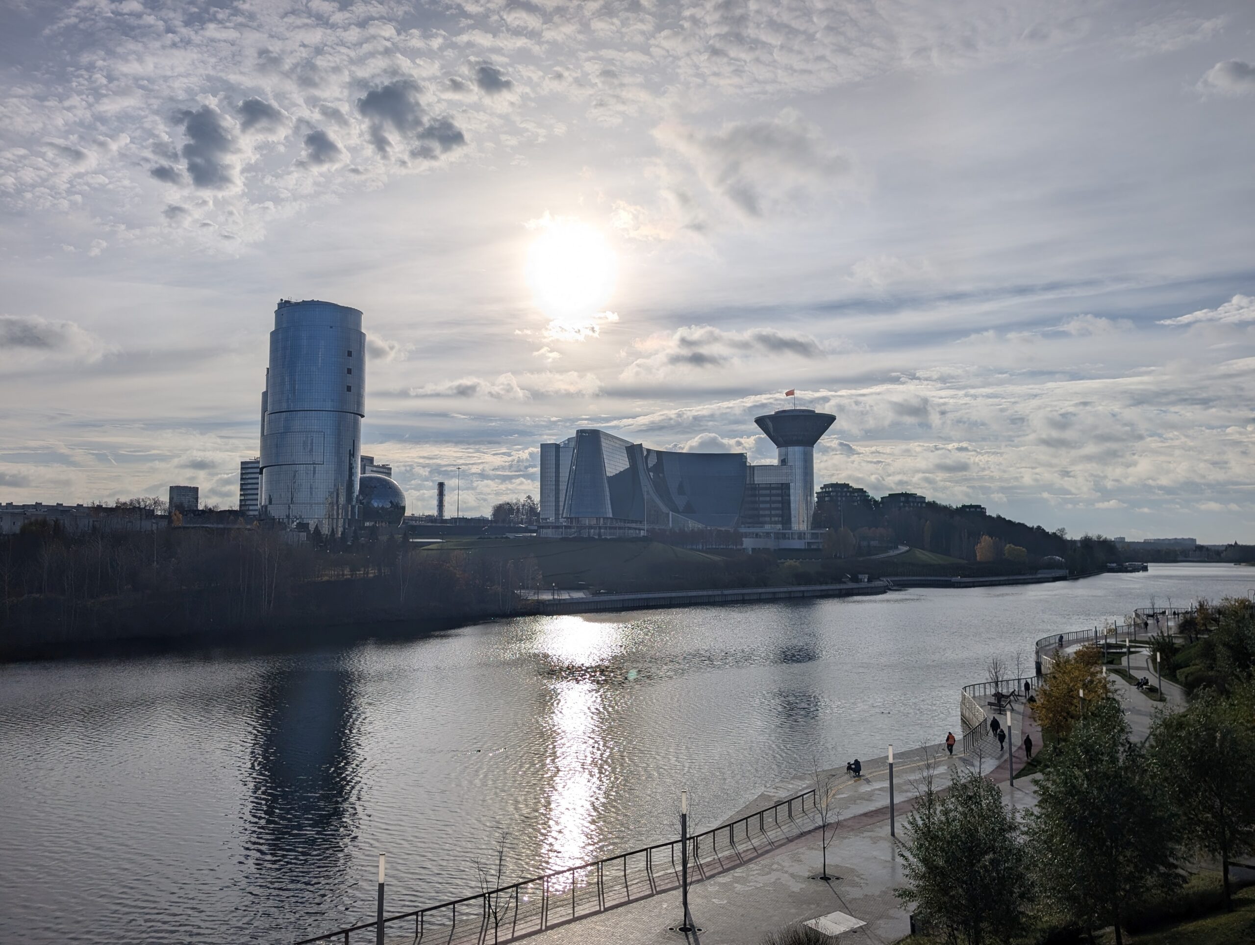 Ещё одно знакомое место — дом правительства Московской области на правом берегу Москвы-реки. Здесь я проезжал весной на открытии сезона, а теперь побывал и осенью, под его конец, причём в обоих случаях погода выдалась солнечная — в этот раз, правда, с переменной облачностью, но она всё равно стала приятным сюрпризом на фоне пасмурных будней прошедшей рабочей недели.