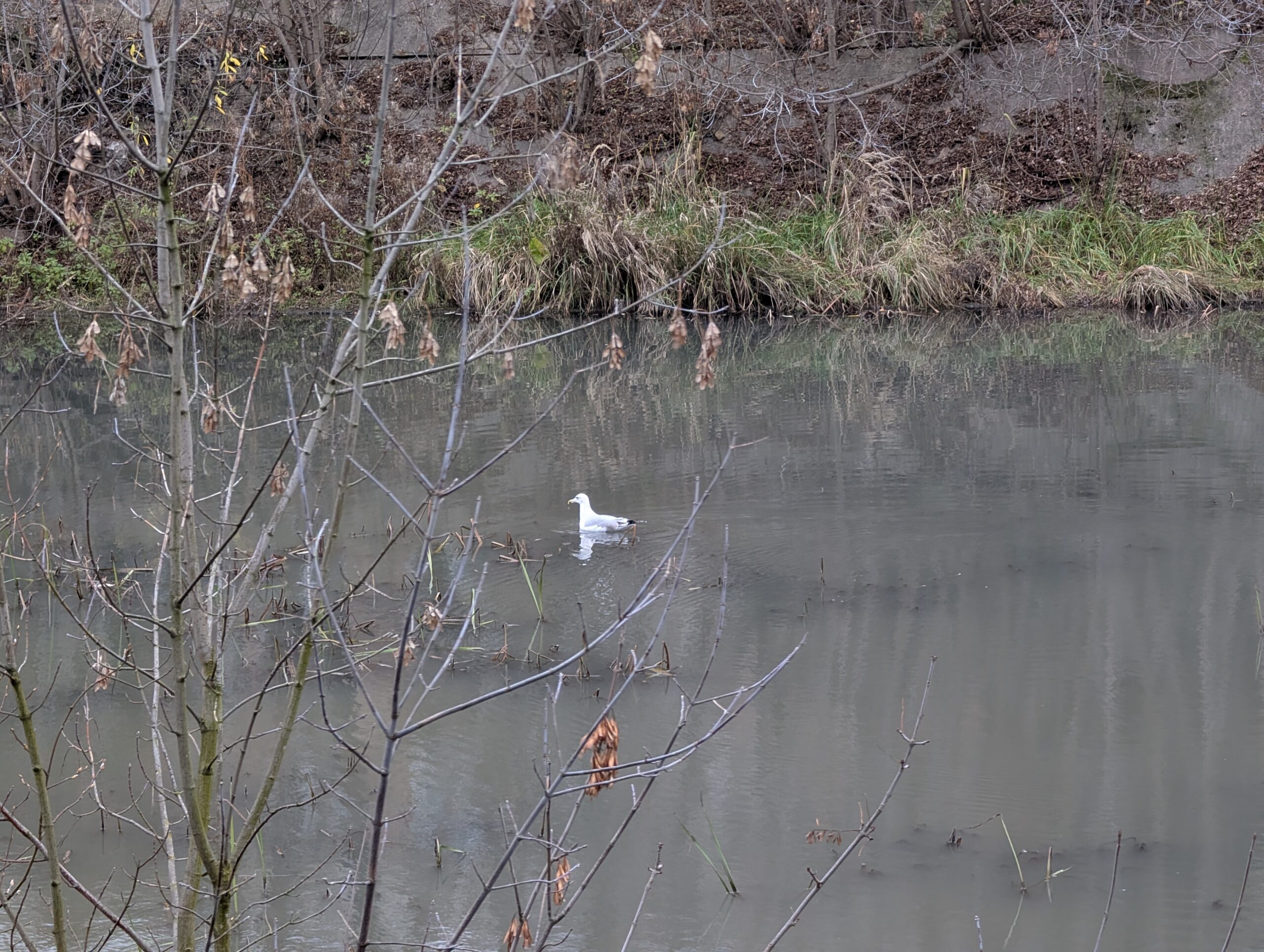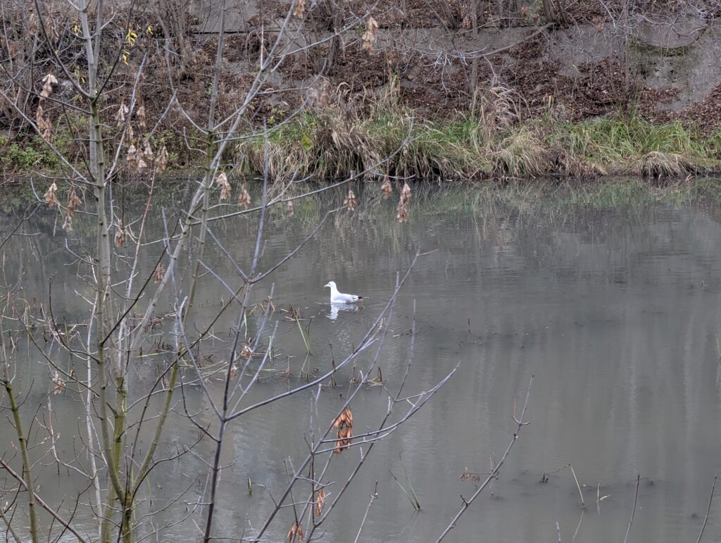 На одном из городских прудов в черте города внезапно обнаружилась одинокая чайка, по каким-то причинам до сих пор не улетевшая в тёплые края. Видимо, она посчитала, что легче будет находить себе пропитание на помойках — за него, конечно, придётся конкурировать с местными врановыми, но чайка — птица крупная и агрессивная, в обиду себя не даст.