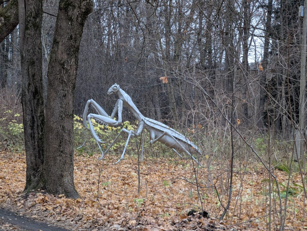 Переделкино знаменито в первую очередь писательскими дачами, многие из которых в настоящее время переоборудованы в дома-музеи, а в остальных до сих пор ещё кто-то живёт. Несмотря на то, что все окрестные места вроде бы исхожены туристами вдоль и поперёк, здесь есть как минимум один артефакт неопределённого происхождения — скульптура гигантского богомола. Неизвестно также, почему она серого цвета — авторская задумка или просто не хватило сил (средств) на покраску?