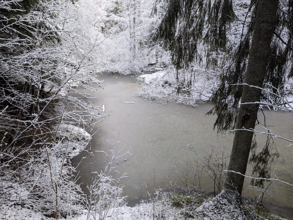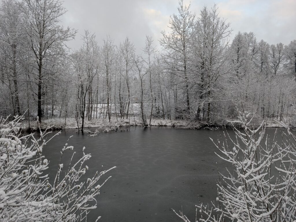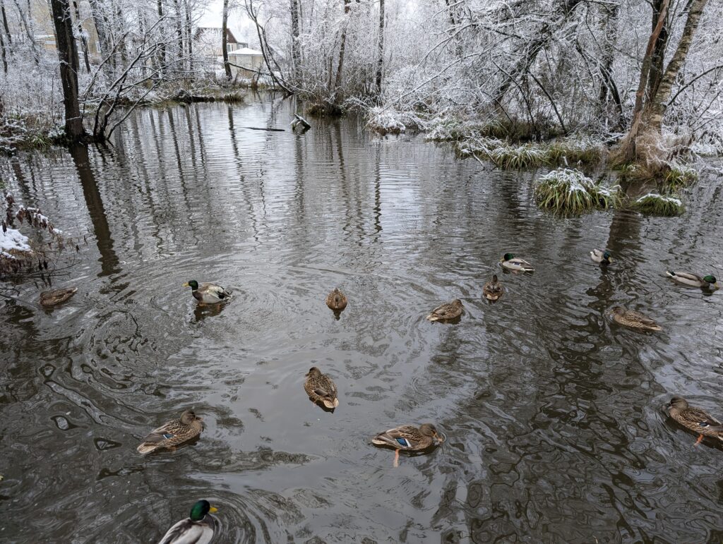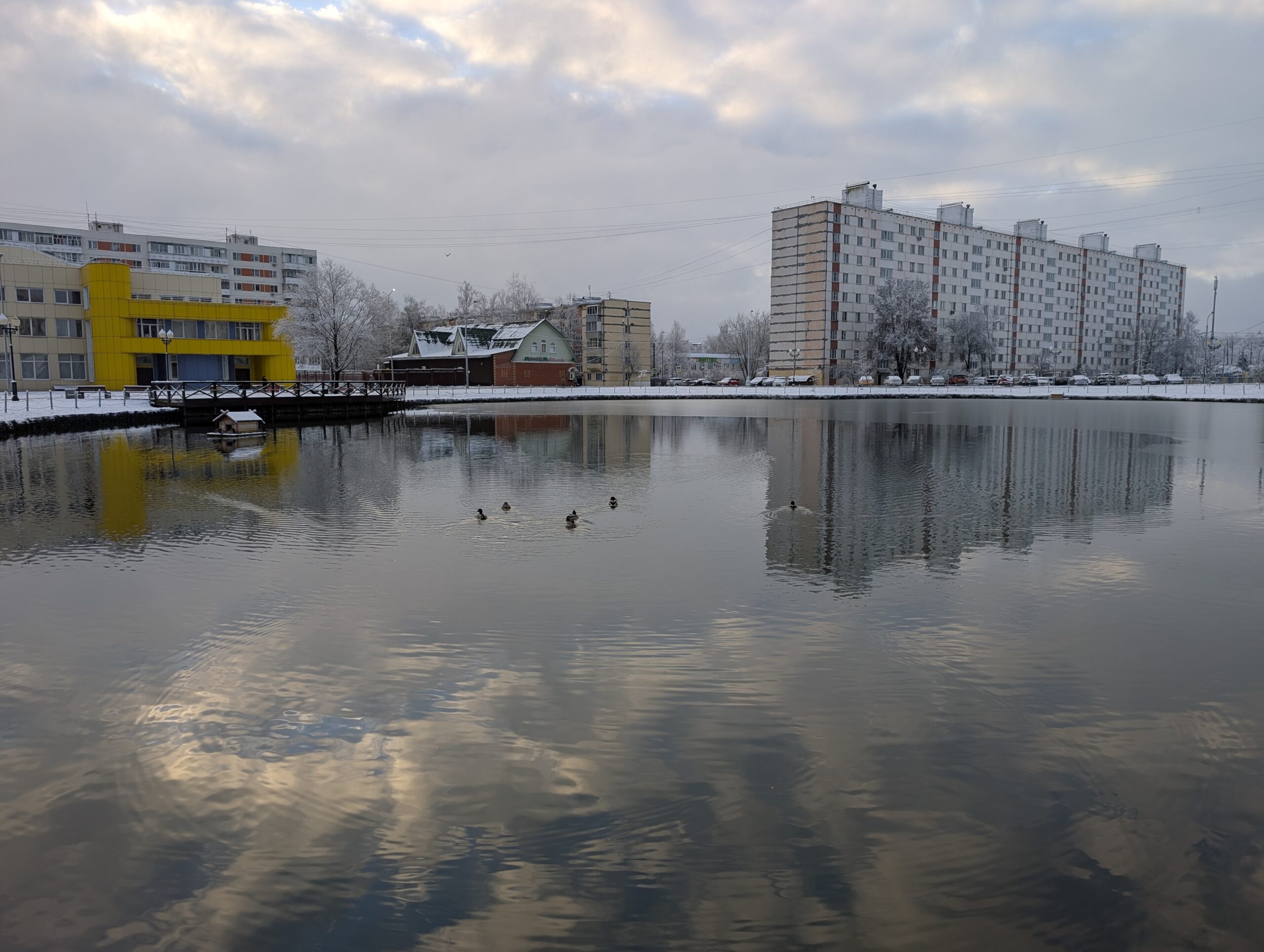 Посёлок состоит не из одних лишь дворов — в его центре расположен пруд, играющий роль основной точки притяжения для местных жителей. В число последних входят и утки, категорически отказавшиеся взаимодействовать со мной даже после того, как я покидал им в воду небольшое количество специально предназначенного для них корма. Впрочем, как говорится, моё дело — предложить, а будет ли предложение принято или нет, от меня уже не особо зависит…