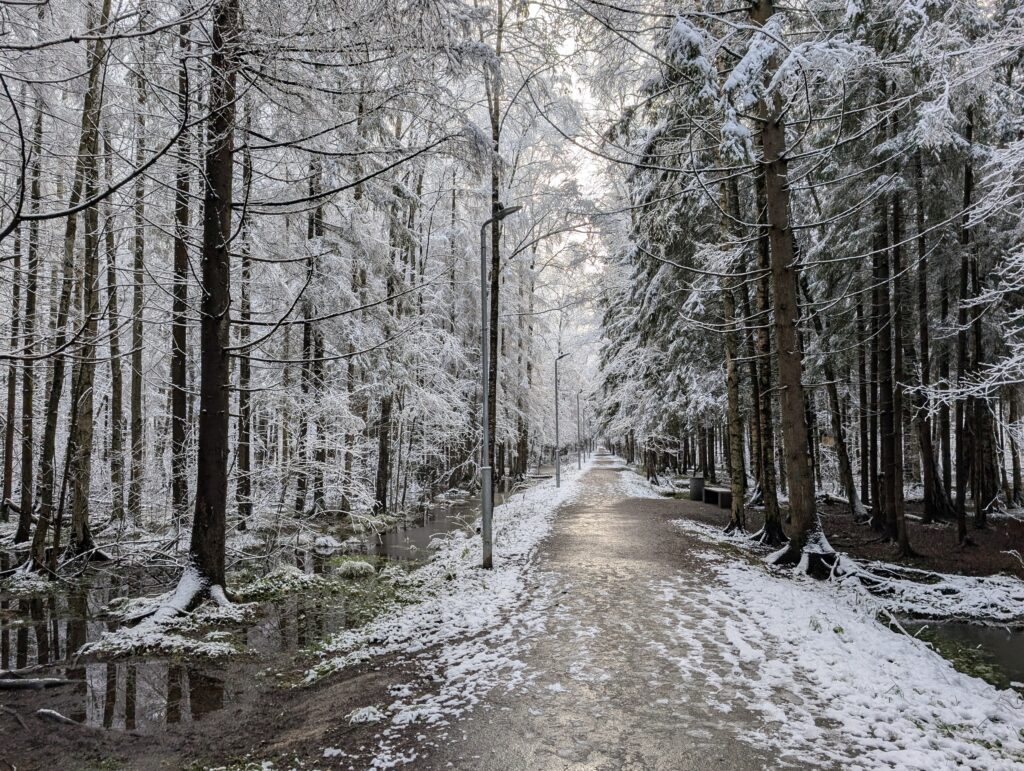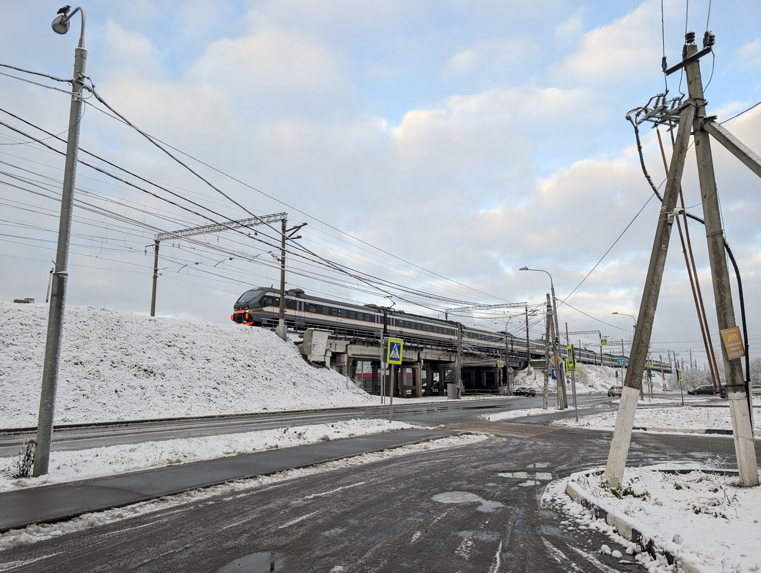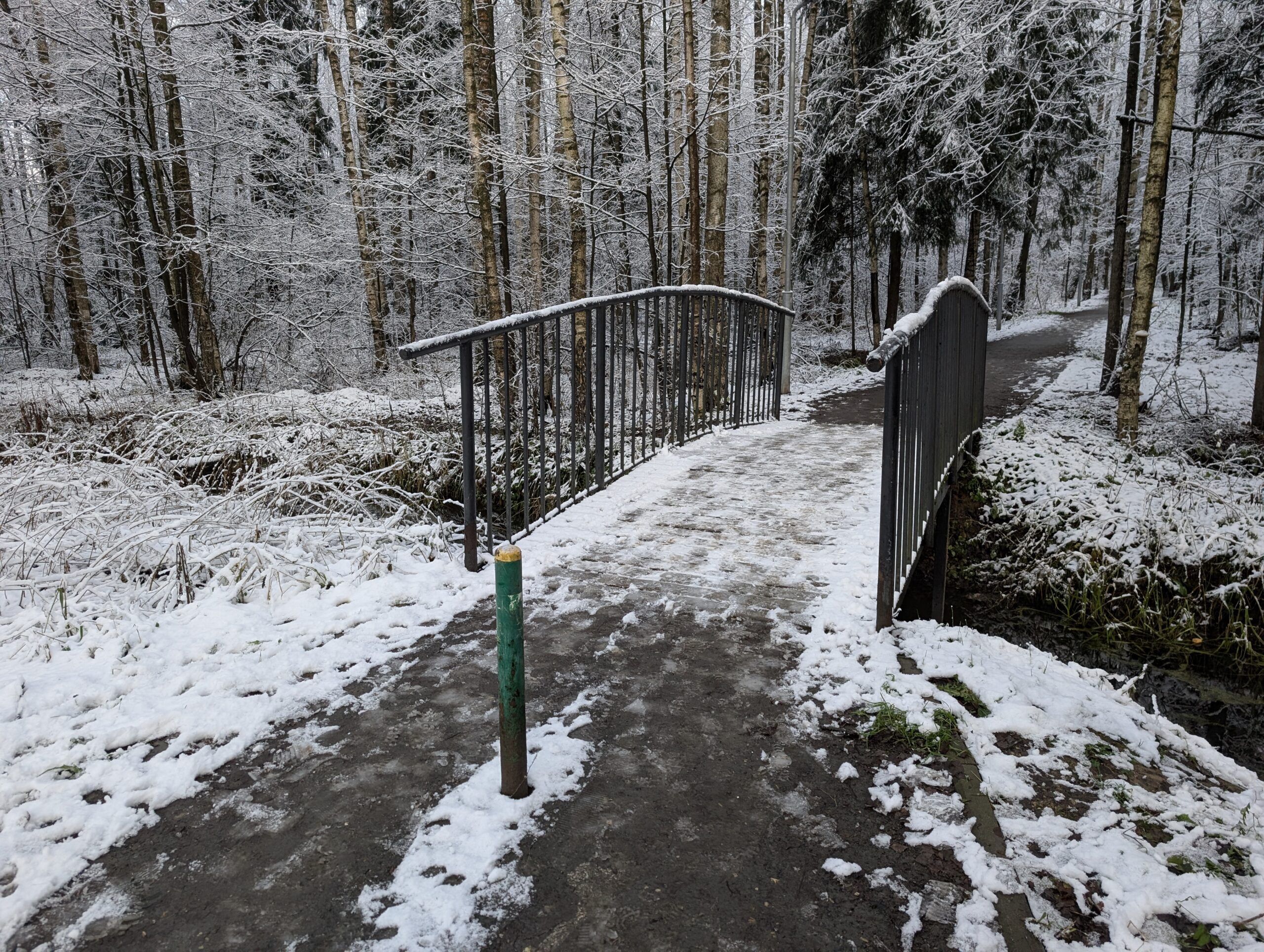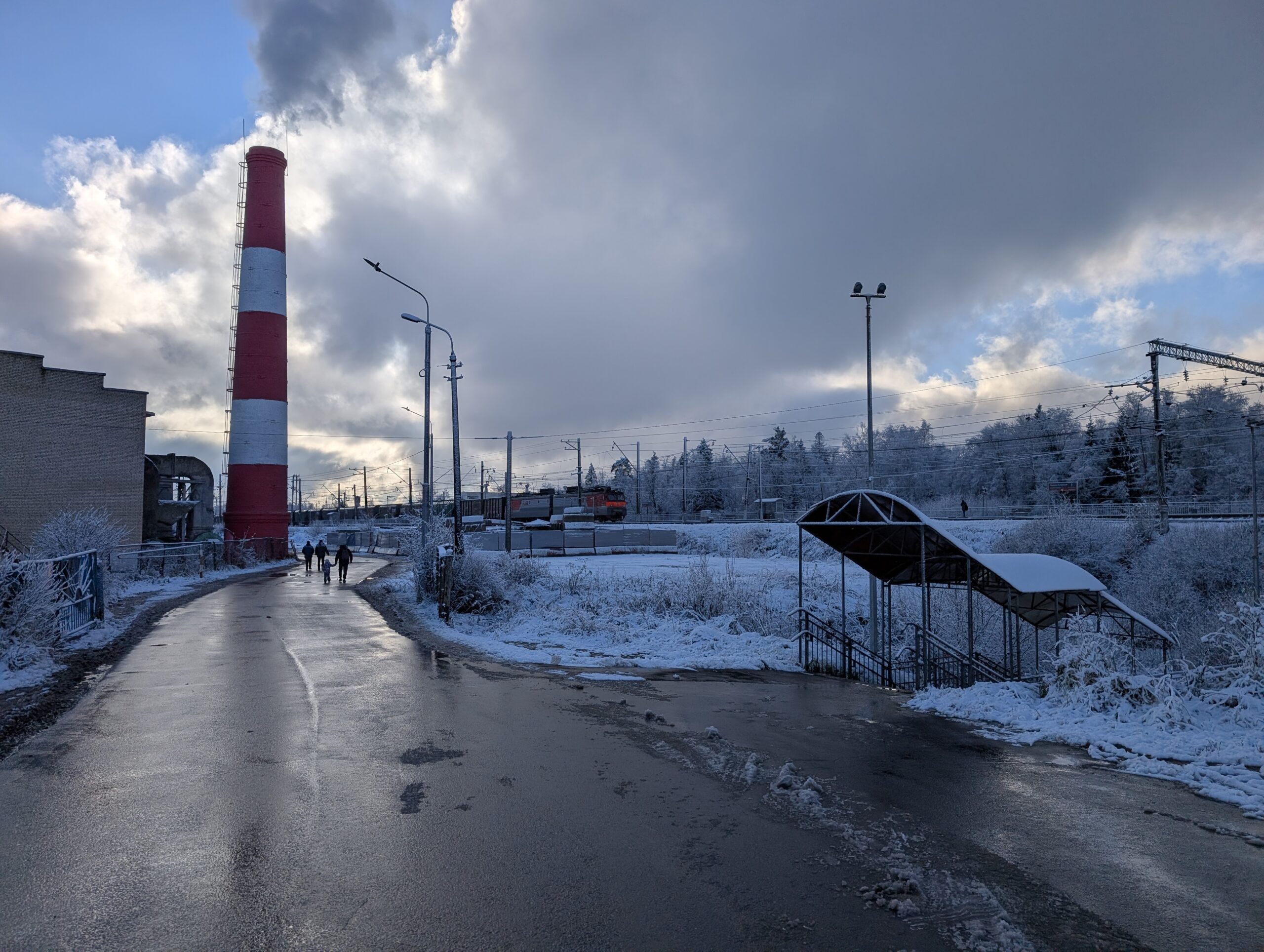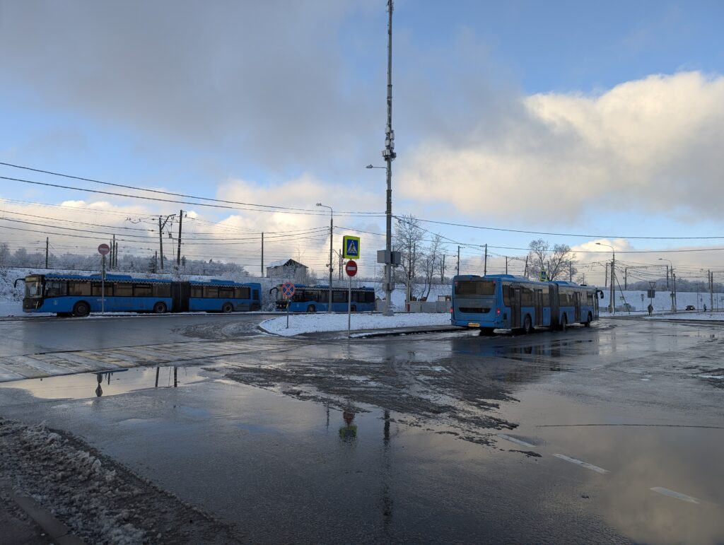 На календаре 23 ноября, предпоследнее воскресенье перед началом календарной зимы. Фактически же зима уже пришла, хотя снег лежит далеко не везде — например, в центре Москвы с утра его не было вовсе. Впоследствии окажется, что надолго задерживаться зимняя погода у нас не собиралась, да и проявление её было крайне локальным, так что мне в какой-то степени повезло столкнуться с ней именно здесь. Не хватает лишь солнца, но очень скоро и этот недочёт будет исправлен — тучи уже начинают постепенно расходиться.