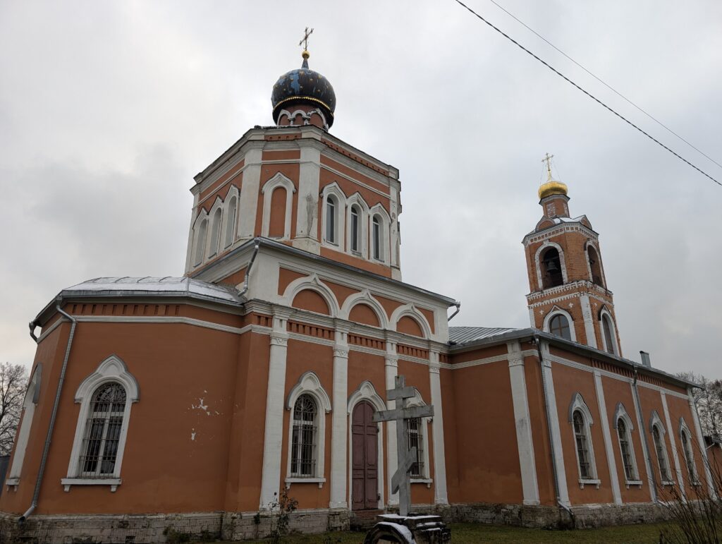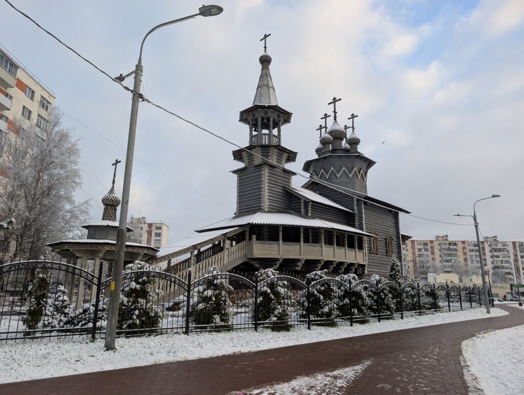 За моей спиной стоит деревянная церковь, очень отдалённо напоминающая аналогичную церковь в моём районе, но значительно более солидного вида. Это единственное сооружение религиозного характера во всём посёлке — с учётом его (посёлка) размеров это неудивительно, хотя от Новой Москвы подсознательно всё равно ожидаешь чего-то большего.