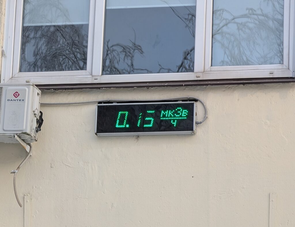 Электронное табло на стене здания администрации посёлка показывает дату, время, температуру воздуха и зачем-то ещё радиационный фон. Показание 0.15 мкЗв/ч соответствует норме — ядерной катастрофы пока не случилось, жить можно. С другой стороны, если произойдёт действительно что-то серьёзное, то смысла в таком табло будет не так уж и много…