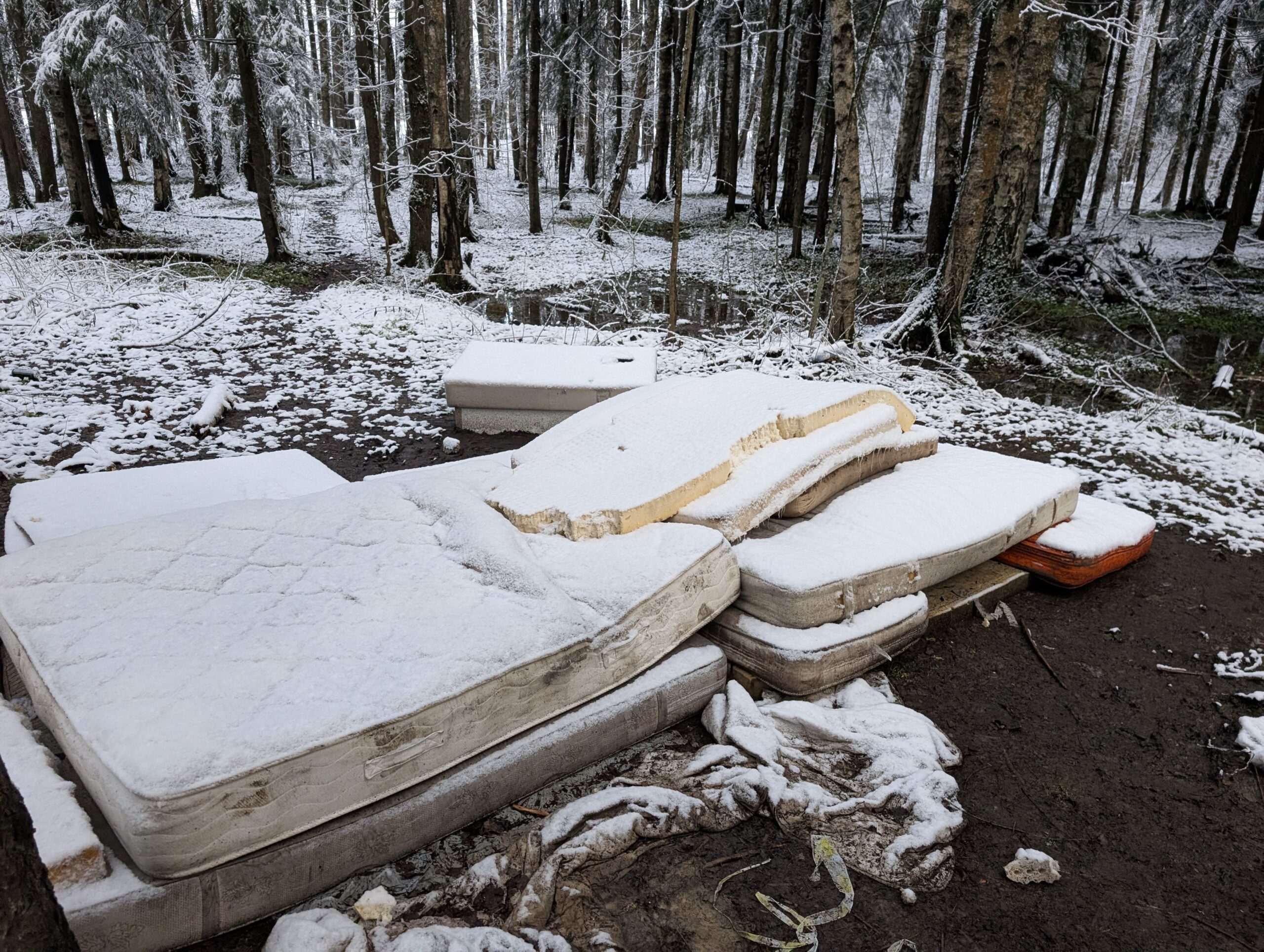 К сожалению, цивилизация нередко выходит за пределы установленных границ, и выражается это далеко не лучшим возможным образом. Замечу, что мусорные контейнеры стоят всего в сотне метров от этого места, но кому-то всё равно показалось хорошей идеей устроить в лесу свалку матрасов. Вопросов, конечно, намного больше, чем ответов, и самый главный из них — почему именно матрасы, чёрт подери?