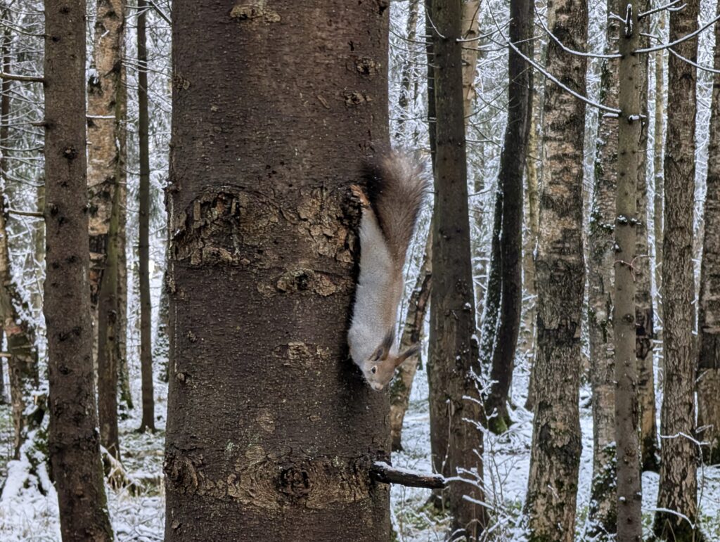 В лесу водятся различные птицы, включая специального трёхпалого дятла, ставшего для меня в какой-то степени гвоздём программы по изучению местной фауны — ещё бы, не каждый же день встречаешь абсолютно новый для тебя вид пернатых! Не обошлось и без привычных всем белок, не испытывающих особого страха перед людьми. Эх, жаль, нет у меня с собой ореха…