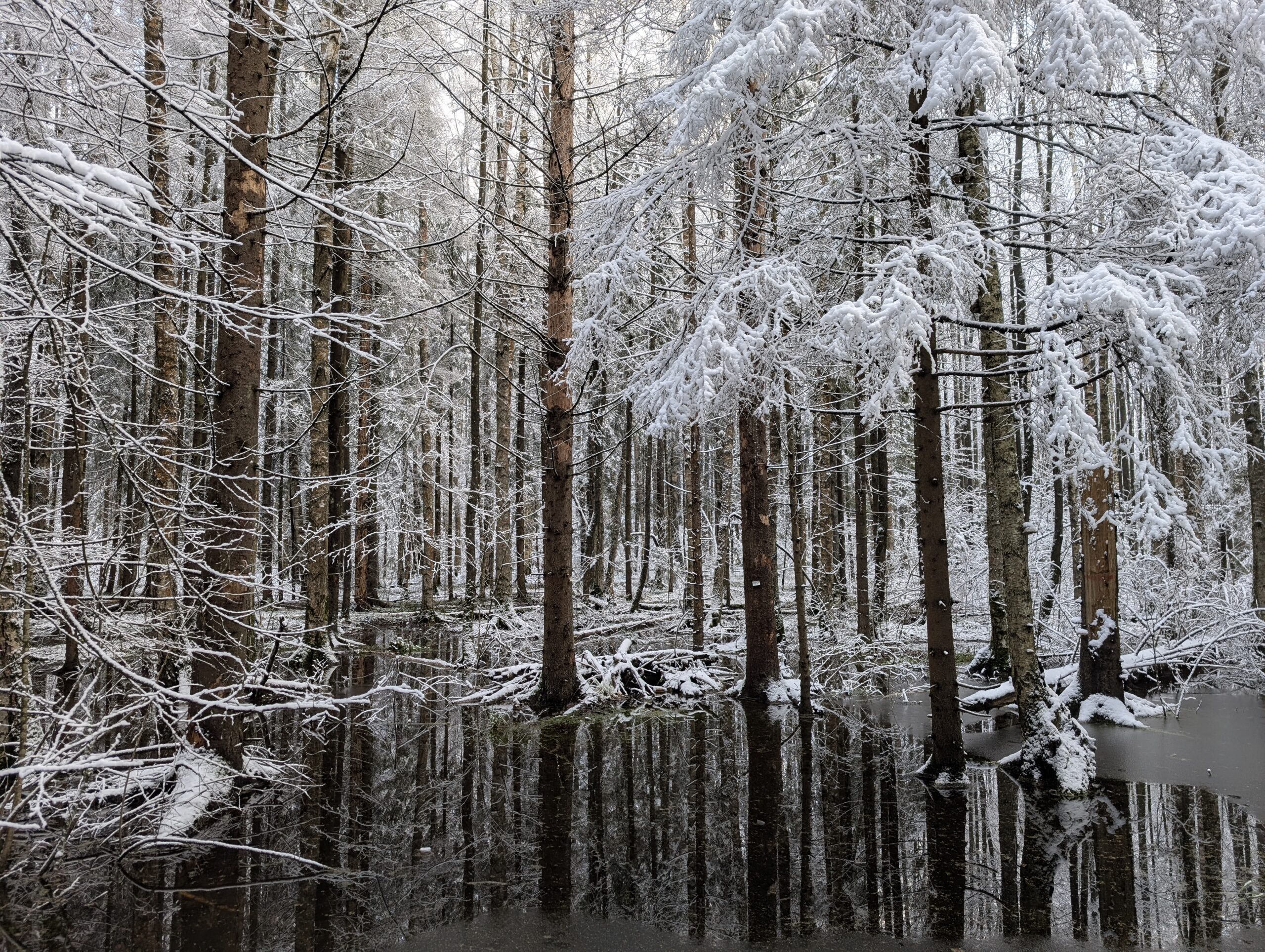 Почти весь лесной массив стоит на болотах, в связи с чем было высказано обоснованное предположение, что в летний период жителей Киевского атакуют бесчисленные полчища комаров, но экспериментально подтвердить или опровергнуть данную гипотезу пока что не представляется возможным. Но можно точно сказать, что зимой заболоченный лес смотрится очень красиво. И ещё немного таинственно — ведь просто так с маршрута не сойти, не узнать, что скрывается в его глубине…