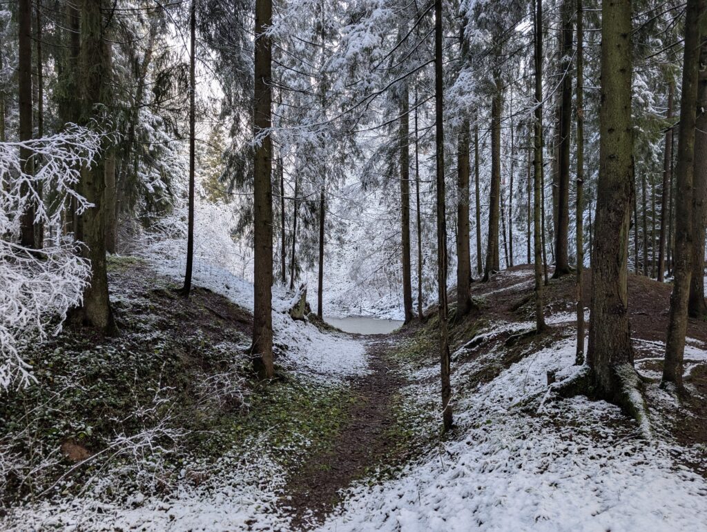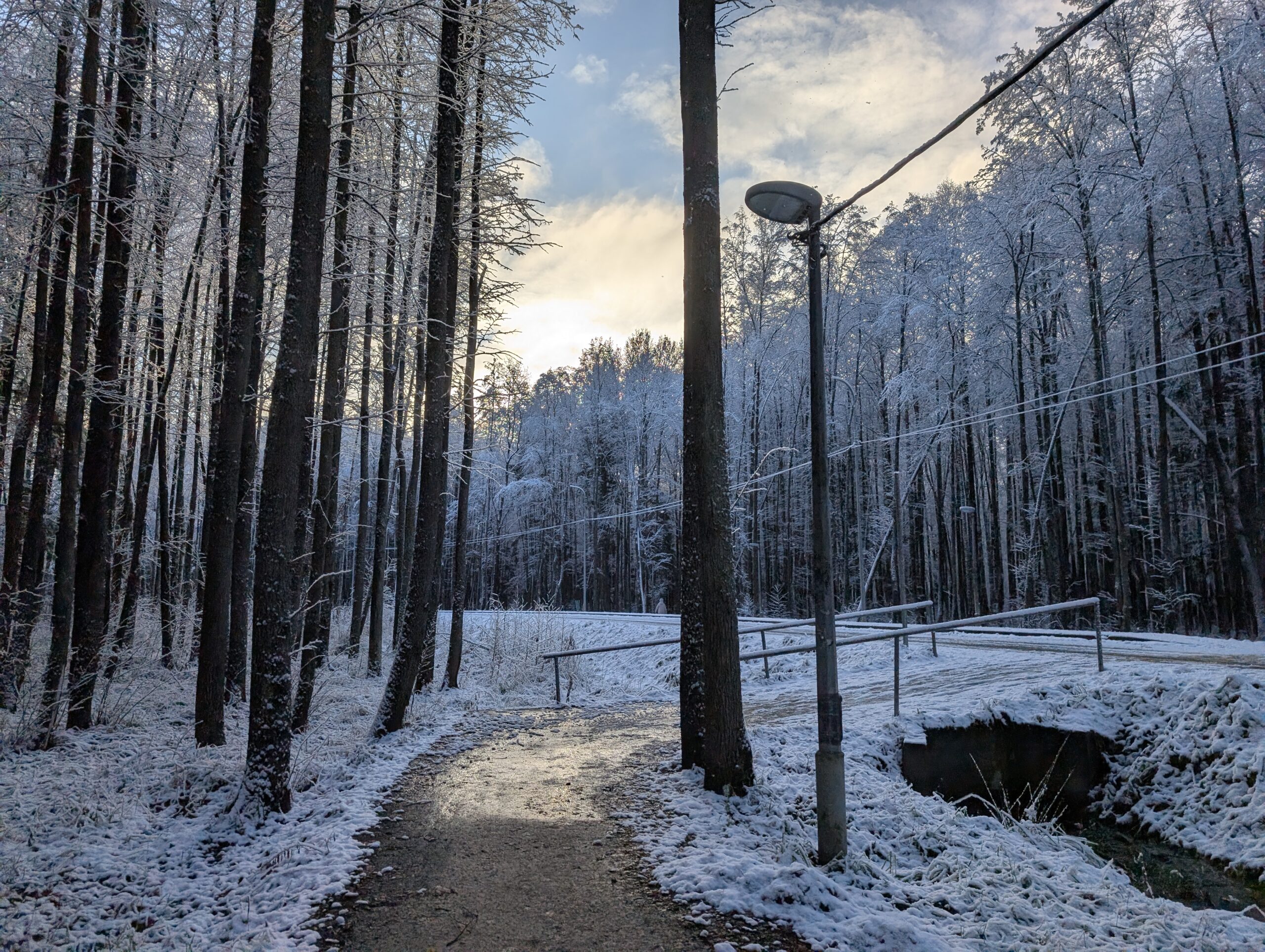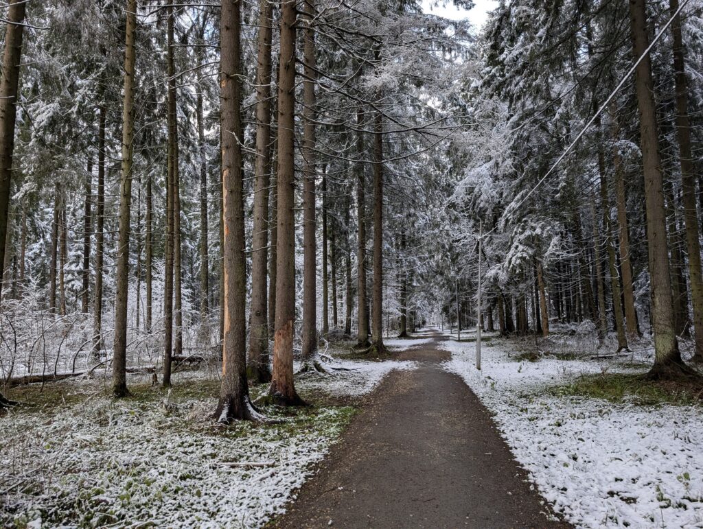 Примерно в районе матрасного склада дорожка поворачивает направо, уводя прочь от Киевского шоссе в строго перпендикулярном ему направлении (чем дальше в лес, тем меньше шума от машин). Конечно, говоря о границе цивилизации, я немного слукавил: уличное освещение является одним из её признаков, так что по факту никаких границ я не переступал, но смена обстановки всё равно ощущается. Людей здесь гуляет немало, потому что больше гулять просто негде — чтобы сделать нижеследующее фото, на котором нет посторонних лиц, потребовалось сначала выждать подходящего момента.