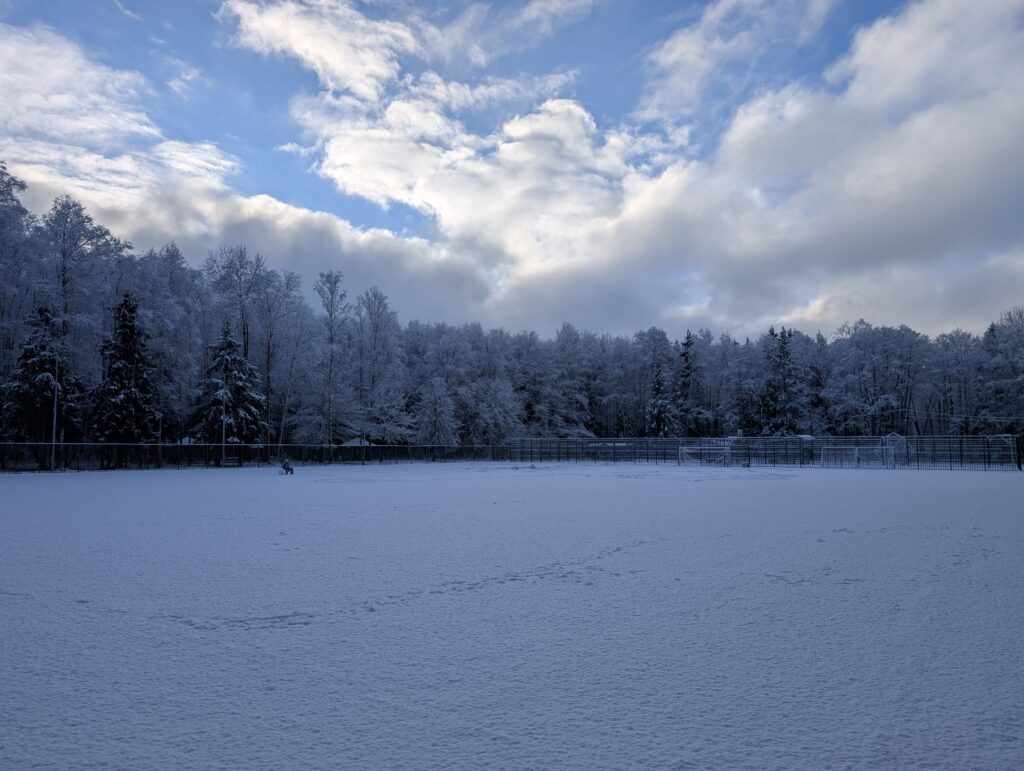 А если пойти в противоположном направлении, то путь вскоре раздвоится. Направо пойдёшь — обратно в посёлок выйдешь, налево пойдёшь — к стадиону попадёшь. Хотя по факту это не полноценный стадион, а обычная спортивная площадка, предусмотрительно вынесенная за пределы жилой зоны и окружённая со всех сторон лесом.