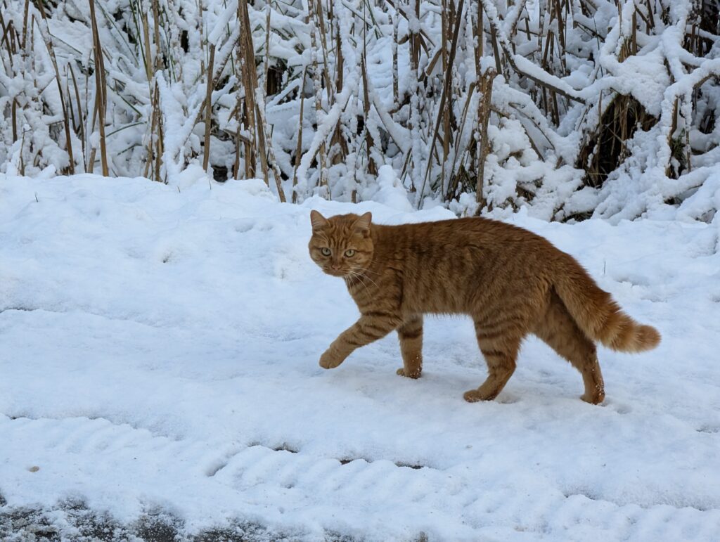 Рядом с очистными обитает подозрительный рыжий кот. Подозрительный не в том смысле, что он подозрительно выглядит, а в том, что к людям он относится с крайним подозрением, предпочитая соблюдать дистанцию при общении с ними. Фотографироваться он тоже не сильно любит — стесняется, наверное.