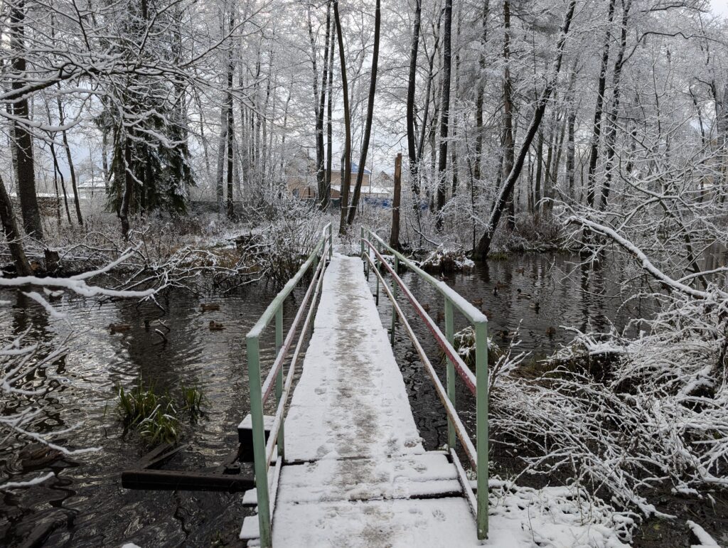 Массив садовых участков делится на две не равные между собой части речкой, но форсировать водную преграду не придётся — достаточно воспользоваться пешеходным мостиком. Опытным путём выяснилось, что самая большая концентрация уток наблюдается как раз у этого мостика. Птицы не отказываются от предлагаемого им корма и в целом ведут себя крайне дружелюбно, чего совершенно нельзя сказать об их сородичах, обитающих на посёлковом пруду.