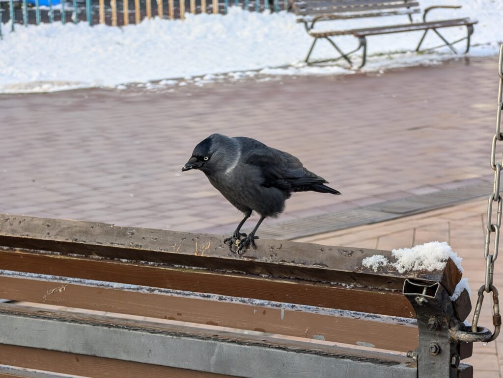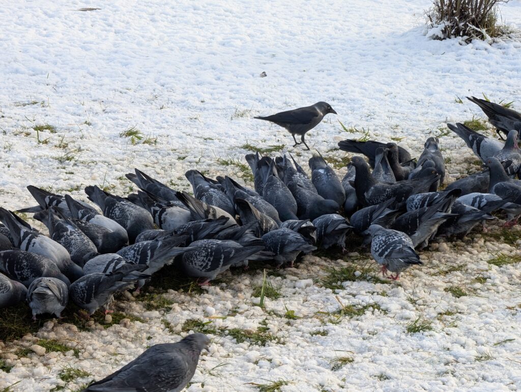 В центре за время моего отсутствия успело сформироваться скопление голубей, в чьи ряды упорно пытаются затесаться галки. Некоторым это даже удаётся, но оставаться в толпе галки не желают, а поступают более хитрым образом — схватив кусок, отлетают в сторонку и спокойно его расклёвывают, не опасаясь посягательств на свою добычу.