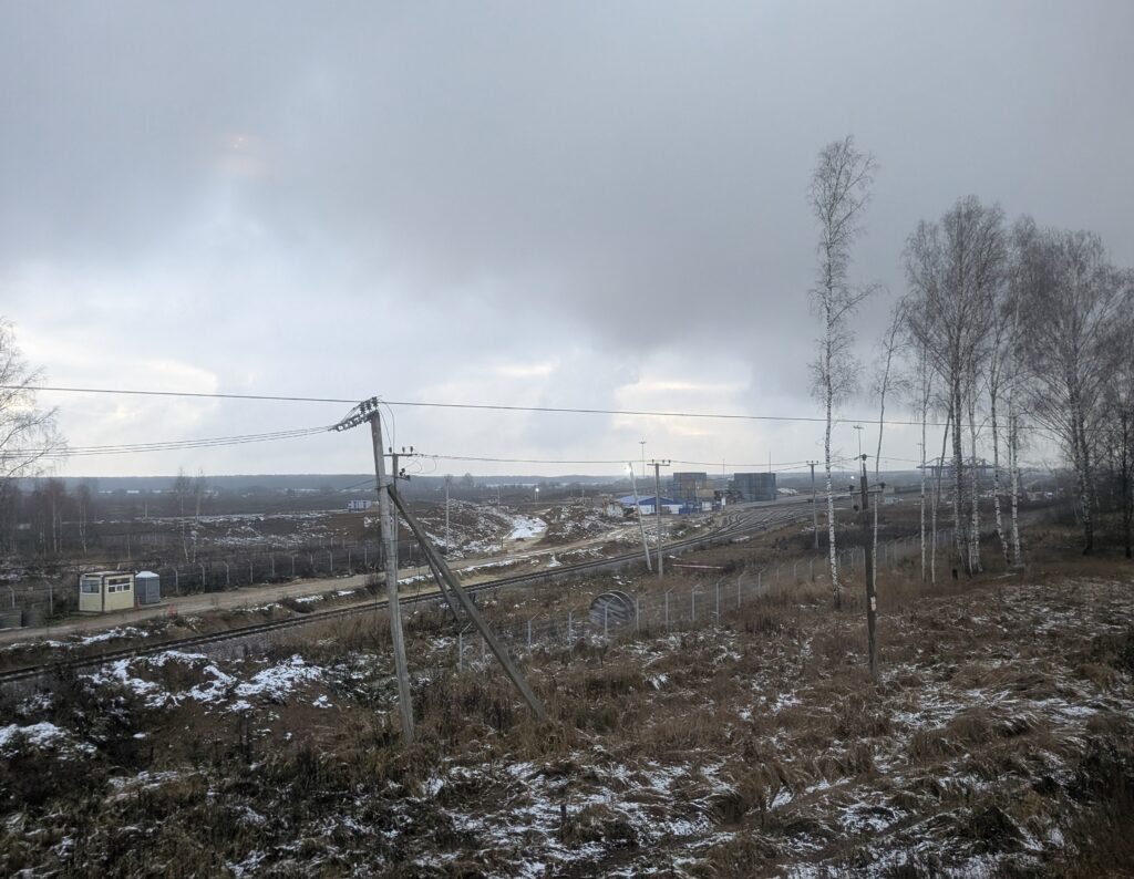 В Усадах недавно построили внушительных размеров контейнерный терминал, причём стройку завершили очень быстро — ещё два года назад здесь был пустырь. Находится эта площадка в буквальном смысле посреди ничего, что вызывает у меня определённые вопросы: для сравнения, аналогичный логистический центр в Белом Расте на севере кольца примыкает вплотную к автодороге А-107, играющей важную роль в грузовых перевозках по московскому региону.