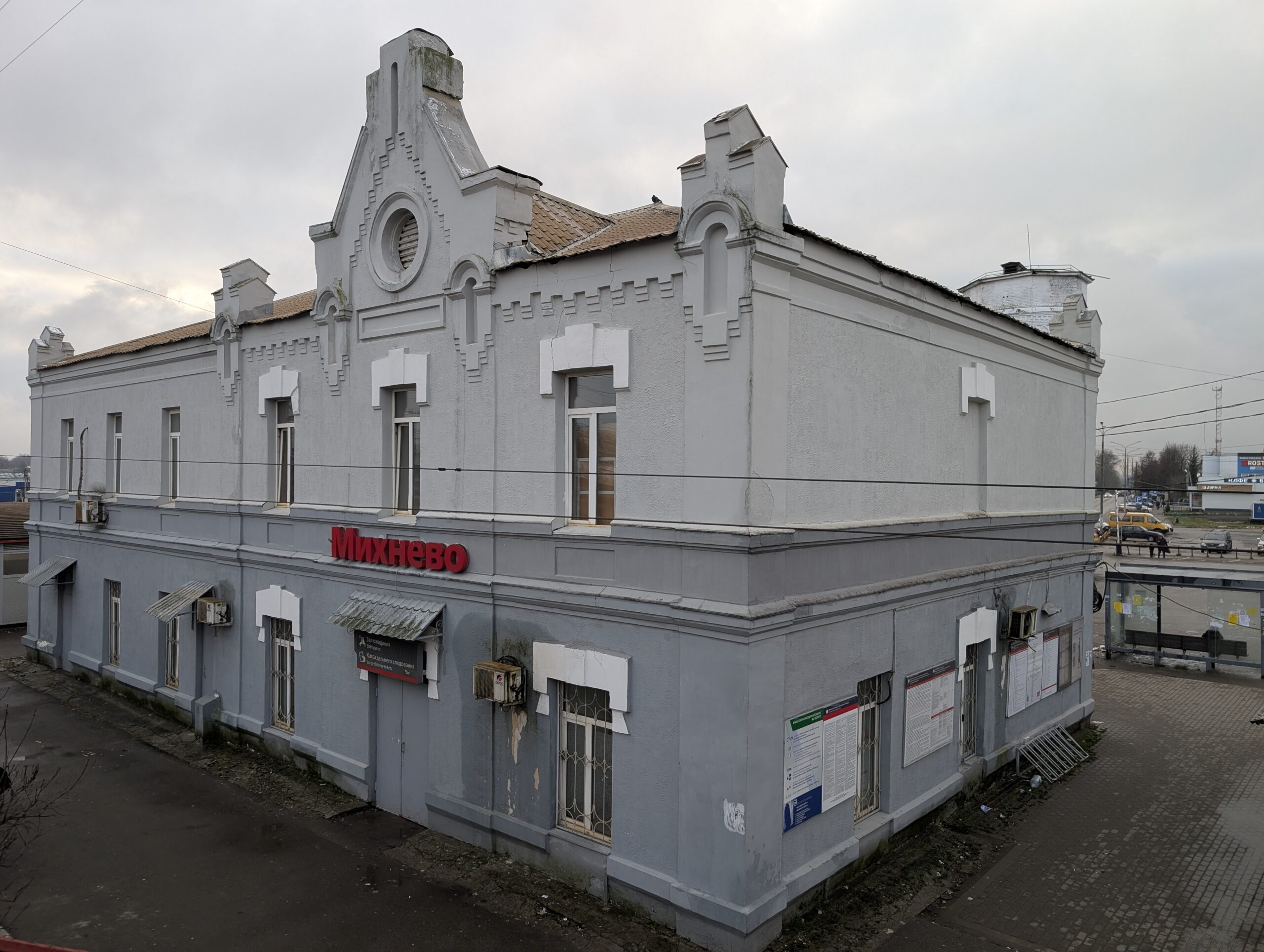 Михневский вокзал сооружён по типовому проекту Рязано-Уральской железной дороги в 1900 году: аналогичное здание стоит, например, в соседнем Жилёво. Цветового разнообразия с прошлого раза поубавилось: нижняя половина здания вокзала была выкрашена в светло-розовый, а водонапорная башня — в жёлтый и белый цвета; ещё раньше таких же цветов был и сам вокзал. Печально, но распространение красно-серой заразы уже не остановить.