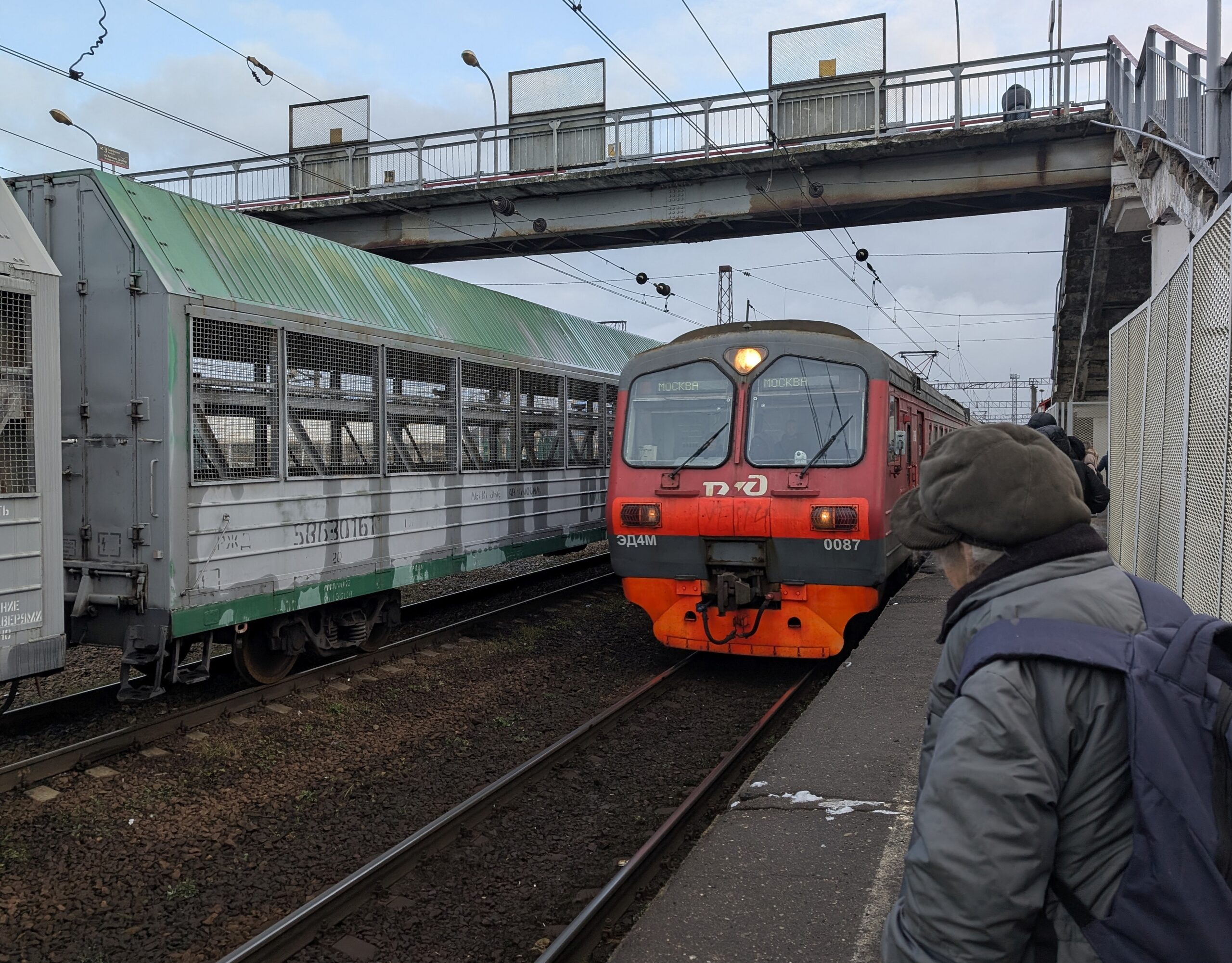 Пока я занимался исследованием местности, доставивший меня утром до Бекасово-1 электропоезд успел вернуться в Москву и отправиться обратно, но теперь уже до Крестов — и вот он прибывает в Киевский точно по расписанию. Жаль, что мне с ним больше не по пути: нужная мне станция лежит намного дальше, поэтому остаюсь на платформе. Другие немногочисленные собравшиеся здесь пассажиры, похоже, также не горят желанием на нём ехать. Следующий рейс через пятнадцать минут, а потом… только через четыре с лишним часа — думаю, не стоит объяснять, почему электрички на кольце не пользуются большим спросом.