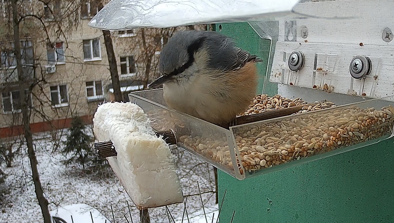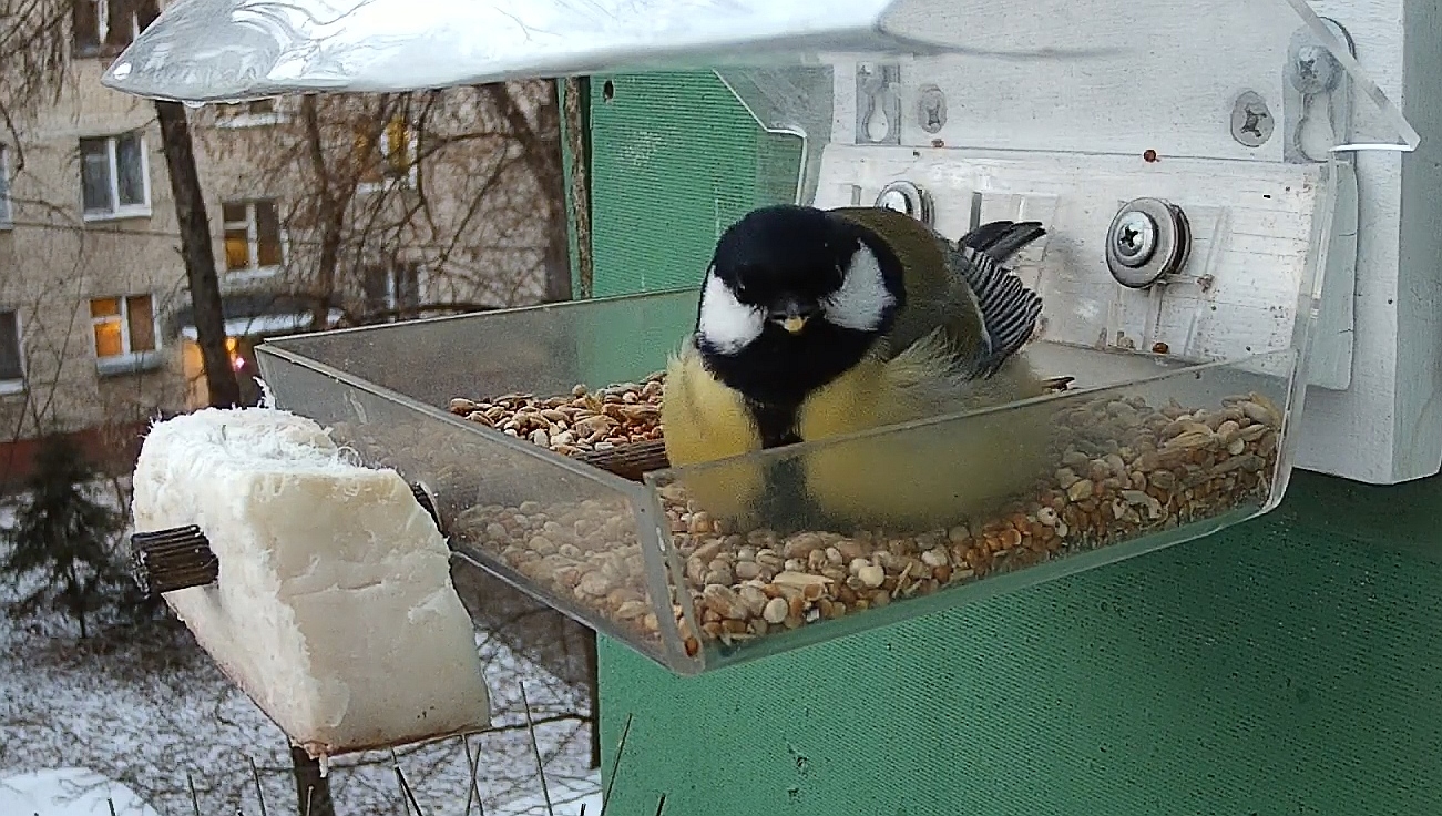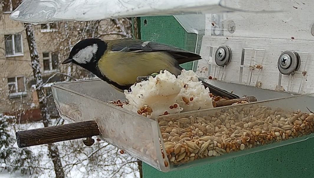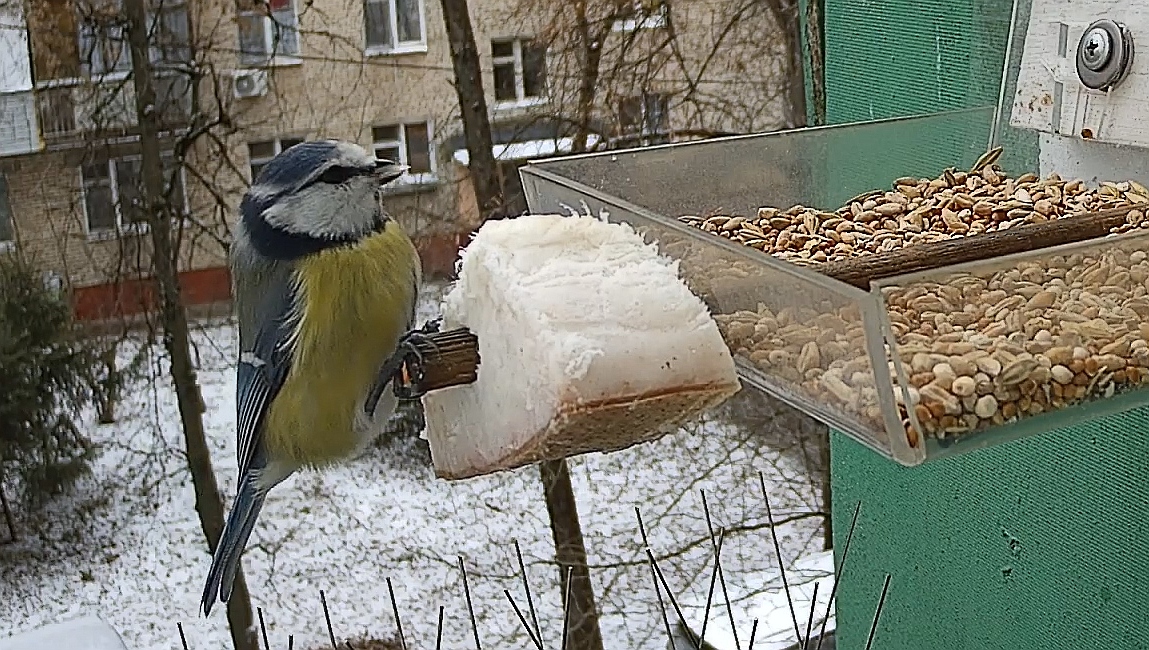 Синицы предпочитают сало по отношению к зерновой смеси, но отдельные особо жирные распушённые птички не отказываются и от неё. Раньше смесь часто прилетали поклевать воробьи, однако в последнее время все они куда-то пропали. Неисповедимы пути воробьиные — в холодную погоду ожидаешь, что они начнут посещать кормушку чаще, но по факту вышло ровным счётом наоборот…