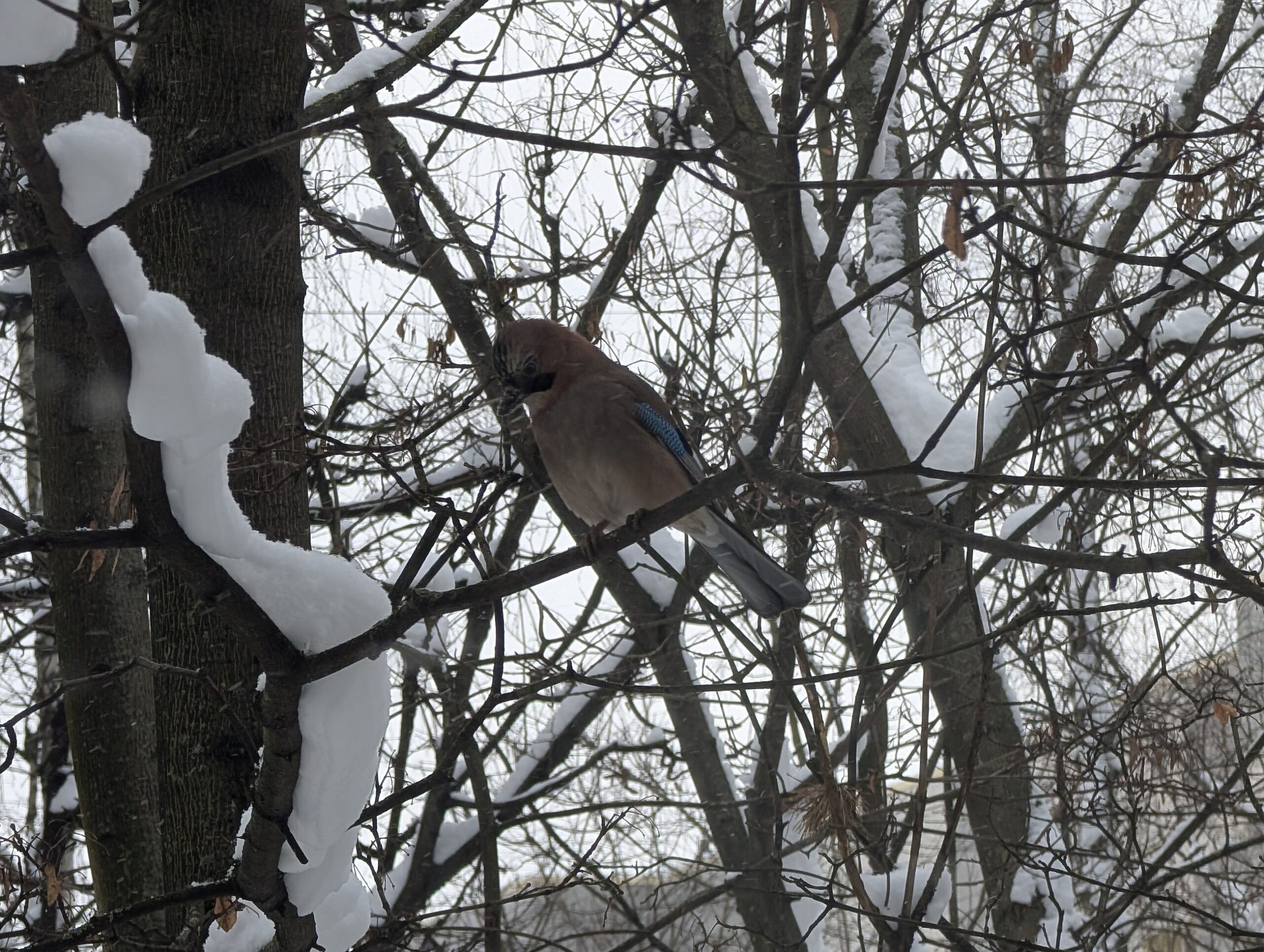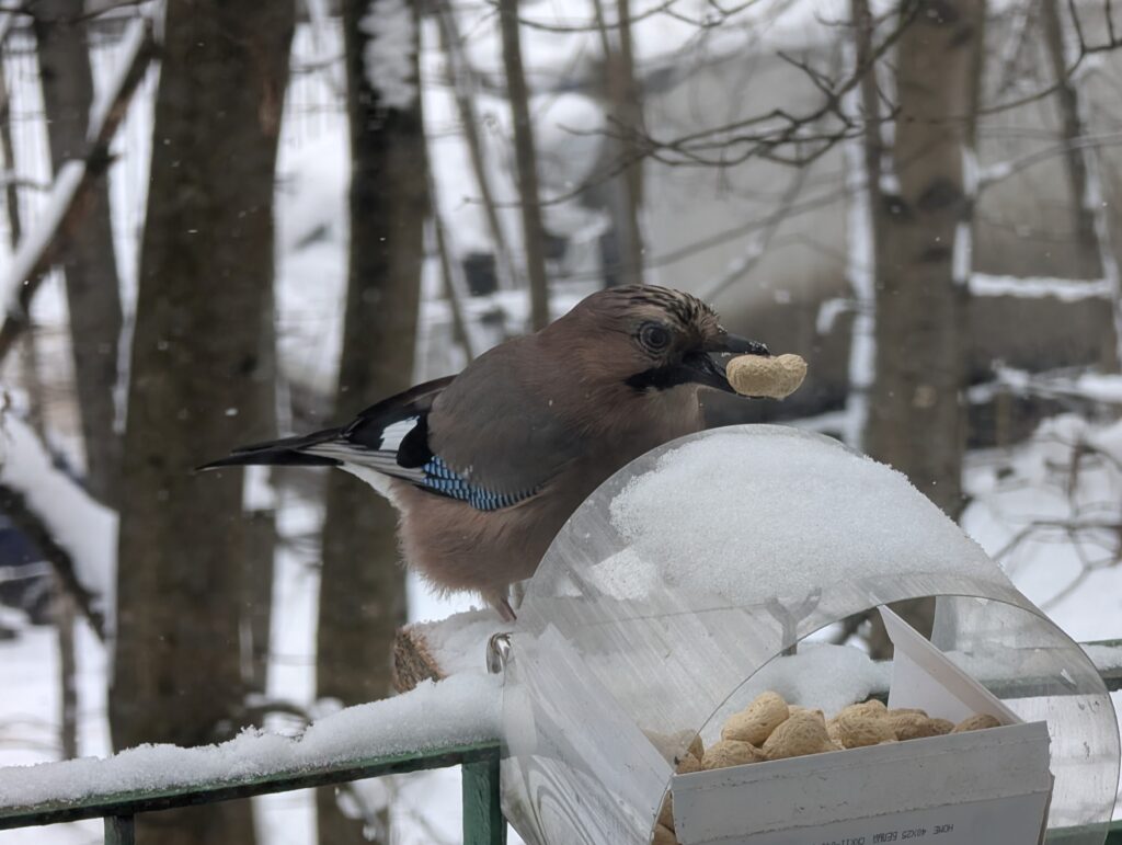 Но вернёмся к нашим сойкам. В начале недели я впервые узнал, что соек в нашей округе орудует как минимум трое — все они уже давным-давно хорошо запомнили, где можно поживиться свежим арахисом, и даже знают, в какое примерно время его выдают. Поэтому очень часто я вижу их заранее сидящими на ветках, когда выхожу на балкон, чтобы насыпать очередную порцию, и всегда этому радуюсь =)