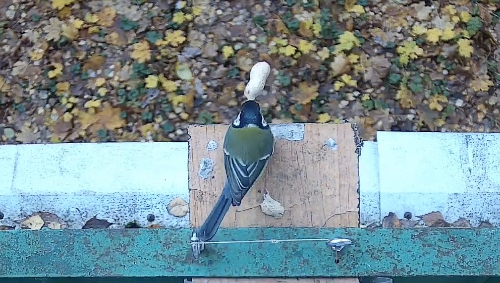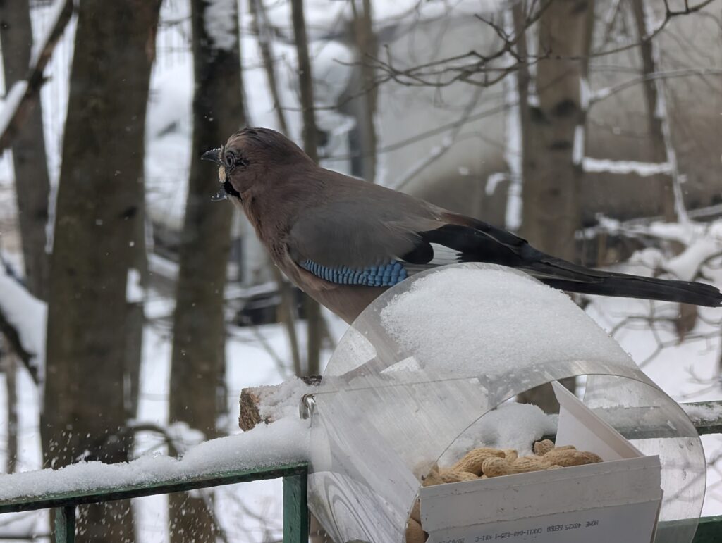 Чтобы на балкон не слетались голуби, в качестве корма я использую исключительно арахис, причём в скорлупе — ведь арахис очищенный привлекает в том числе синиц, у которых есть своё привычное место кормления. Тем не менее, синицы всё равно нередко пытаются украсть арахис у соек, несмотря на то, что большинство попыток заканчиваются провалом — орех падает вниз, с громким звуком ударяясь о крышу нижнего балкона, от чего птичка сразу же пугается и улетает. В последний раз я наблюдал такое осенью.