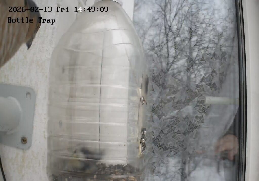 В отличие от основной кормушки с салом, посещаемость кормушки-бутылки, висящей на противоположной стороне дома, в последние месяцы стремится практически к нулю. Это странно, но может объясняться тем, что многим синицам хорошо известно о второй функции данной кормушки — я иногда использую её для установки на них колец, например, чтобы легче было узнавать птиц, гнездящихся в домике. Однако вчера какая-то синица всё же решила туда залезть. И почти сразу же была атакована хищником, но безуспешно — дверца-то уже захлопнулась.