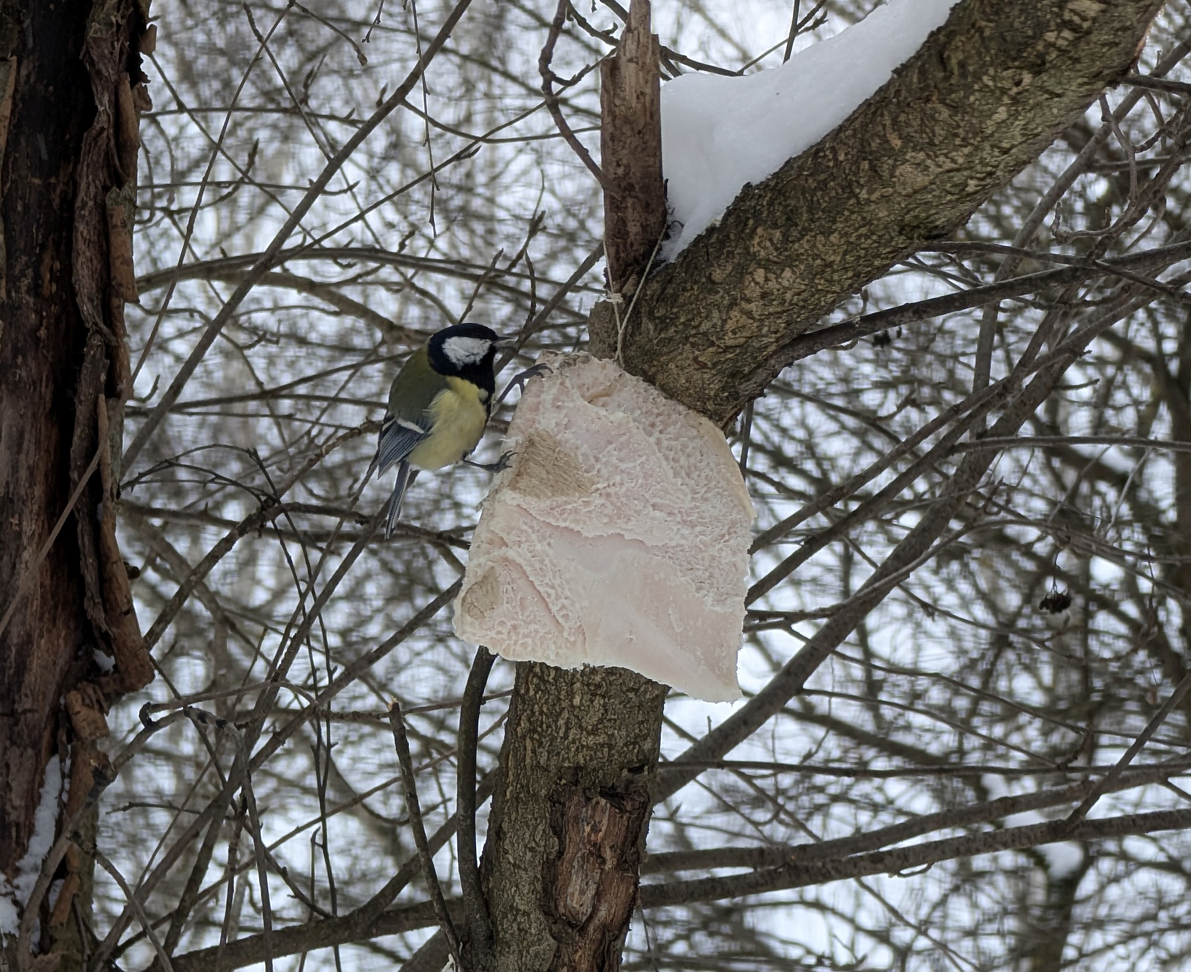 Птицы в Водниках тоже почти наверняка обладают хорошим настроением. А разве может быть по-другому, когда им вешают огромные куски сала? Хотя особого ажиотажа наблюдать мне не довелось, одна из синиц была настолько увлечена едой, что игнорировала почти всё происходящее вокруг, позволив мне подобраться к ней очень близко.