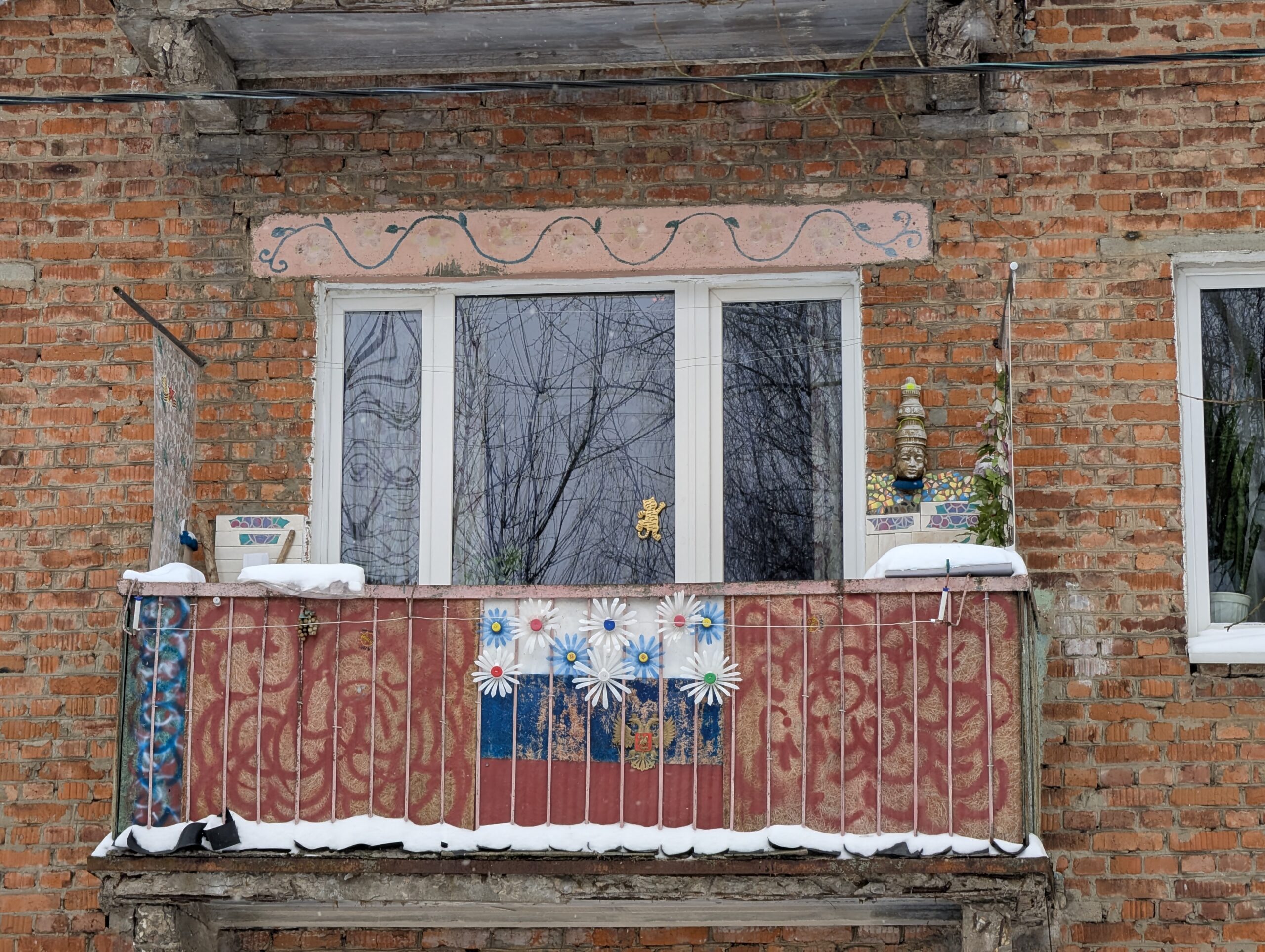 Кирпичные трёхэтажки смотрятся уже немного поприличнее, но почему-то всё равно не внушают особого доверия. Их здесь всего две штуки, 1959 и 1960 годов постройки соответственно. Один из балконов сразу же привлёк внимание своим оформлением — почётного упоминания заслуживает голова индийского (?) божества, висящая справа от окна. Что-то в этом есть…