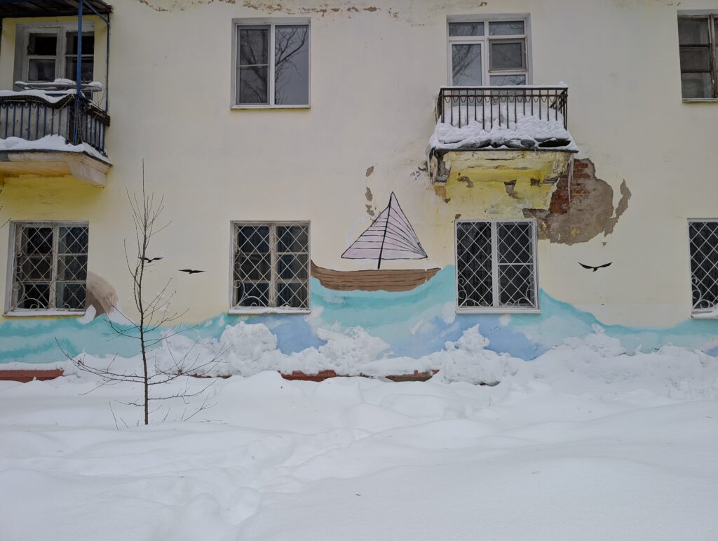 А вот куда бы я точно не захотел переезжать — так это в самые старые двухэтажные дома. Отваливающуюся со стен штукатурку кто-то попытался компенсировать стрит-артом, причём тематическим. Хорошая попытка, но нет. В смысле, рисунок-то мне нравится, но желания пожить в этом доме от него не сильно прибавилось =)