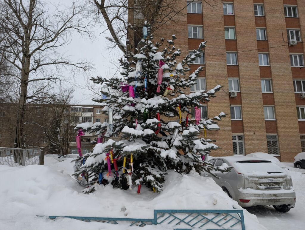 И хотя весна уже достаточно скоро, про новогоднее настроение местные до сих пор не забывают. Особенно радует использование в этих целях настоящих хвойных деревьев, которые здесь, к слову, довольно-таки редки. И сосен, по-моему, нет вообще — одни только ели. Но это уже намного лучше, чем ничего.