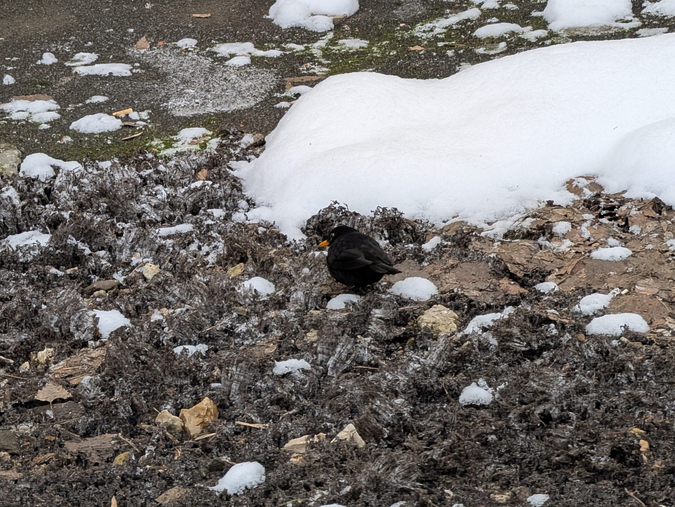 Заметно, впрочем, что снег растаял не полностью — готов поклясться, что ещё совсем недавно здесь всё было занесено. Да, нелегко приходится дроздам зимой…