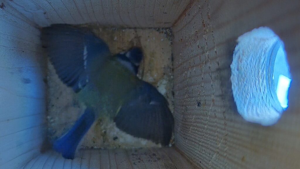 Гнездовой сезон — крайне напряжённый период, особенно в условиях города: подходящих мест мало, и за каждое идёт ожесточённая борьба. Неудивительно, что многие занимают «жильё» ещё зимой, используя его для ночёвки, причём очень часто это птички из той же самой пары, которая ранее уже гнездилась в том же месте. Конкретно в моём случае это был самец лазоревки, принимавший участие в прошлогоднем выведении птенцов — ранее он уже отыскал самку, готовую убирать за ним мусор, а теперь она наконец приступает к строительству гнезда.